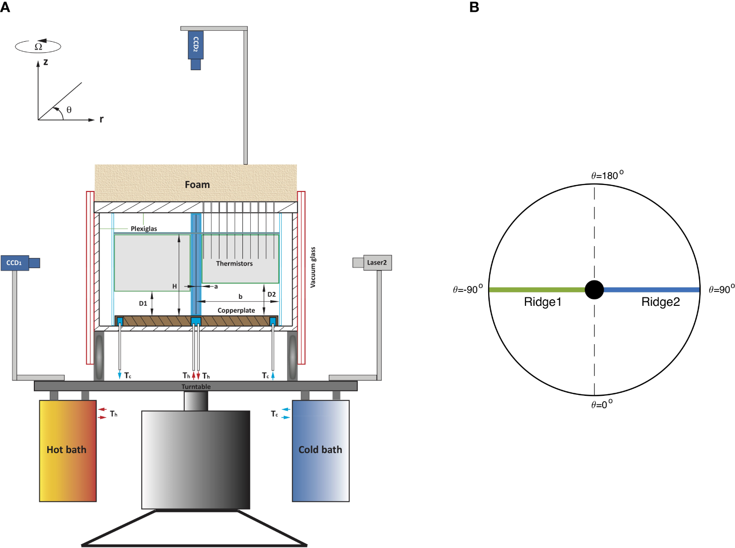 Under the current configuration where a radially-decreasing temperature field is prescribed along the lower boundary, the tank can be viewed as an upside-down ocean with its “abyss” being close to the top lid and the “surface” adjacent to the bottom of the tank (copper plate). The “north-pole” of the experimental ocean, where strong convection takes place nearby, is at the centre of the annulus. The clockwise direction (top view) around the annulus is also referred to as “west” in following discussions. The isothermal surfaces of the experimental ocean are parallel with isopycnal surfaces since the fluid density is only dependent on temperature that is variable.