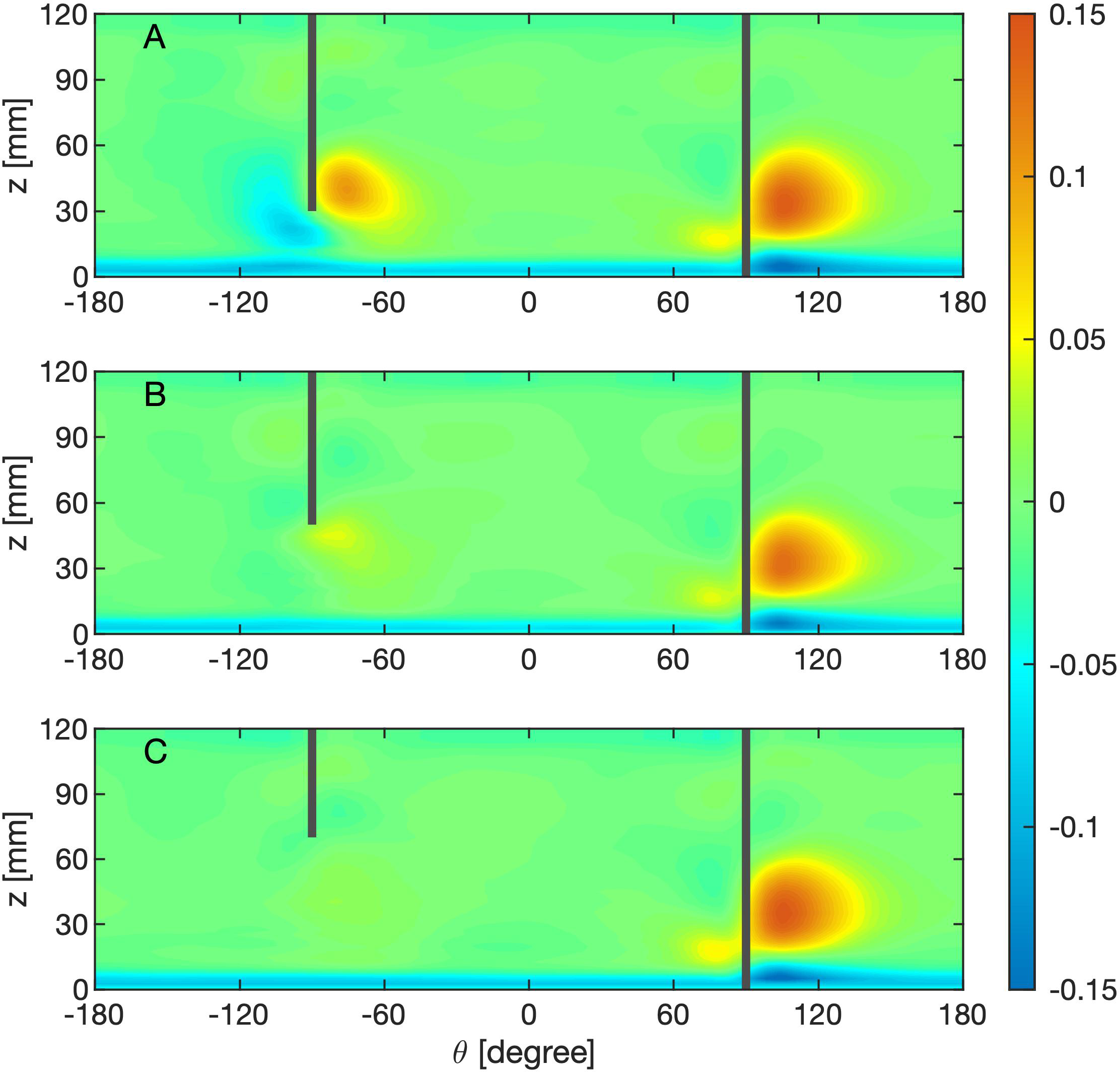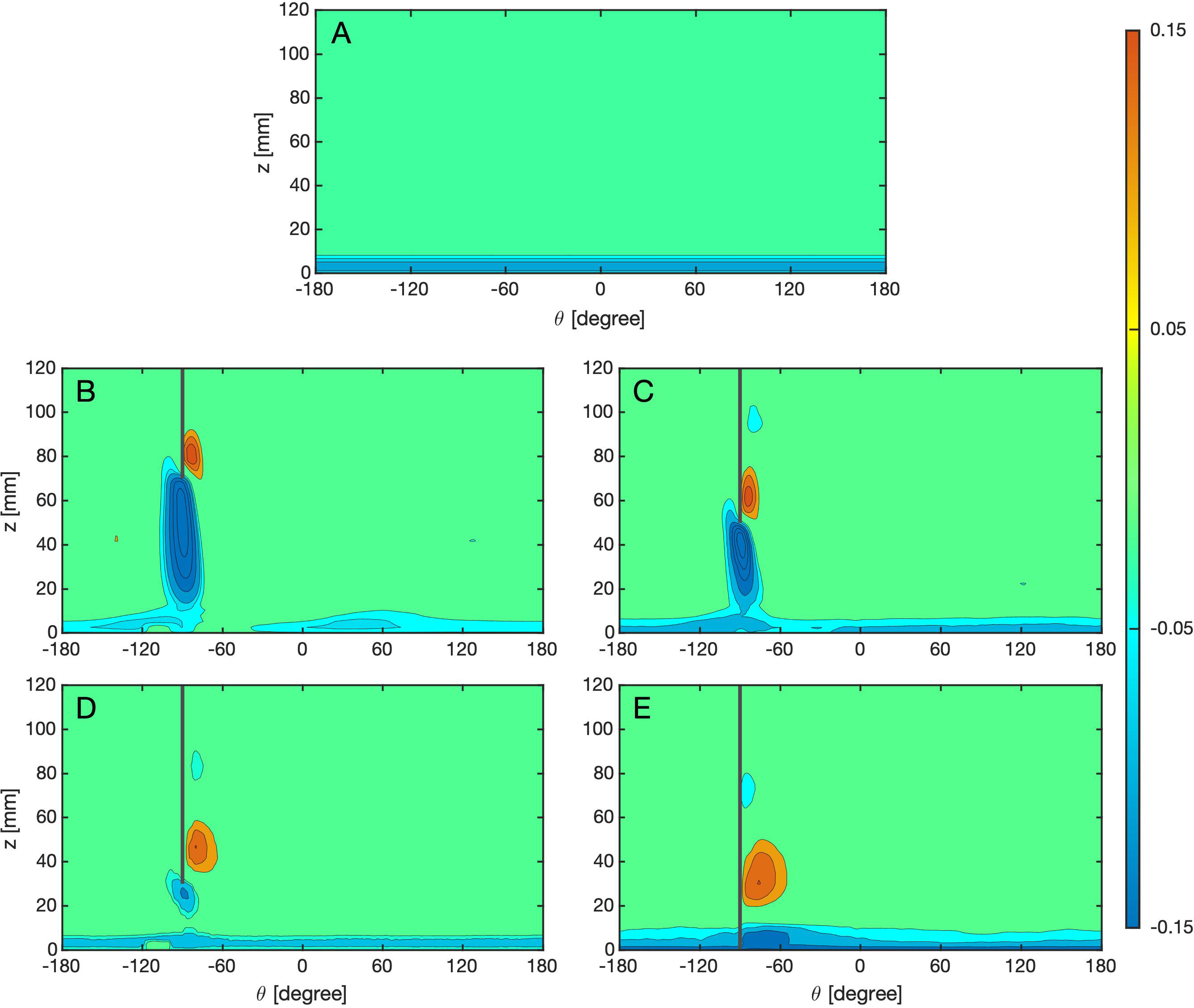 A cylindrical polar coordinate system (r,θ,z) was used in analyzing results. The system has the origin located at the centre of the copper plate, the radial direction directed outwards from the origin, the azimuthal direction directed anti-clockwise when viewed from above and the polar axis directed upward from the base. For convenience, we sometimes used “zonal” and “meridional” to refer to azimuthal and radial directions.