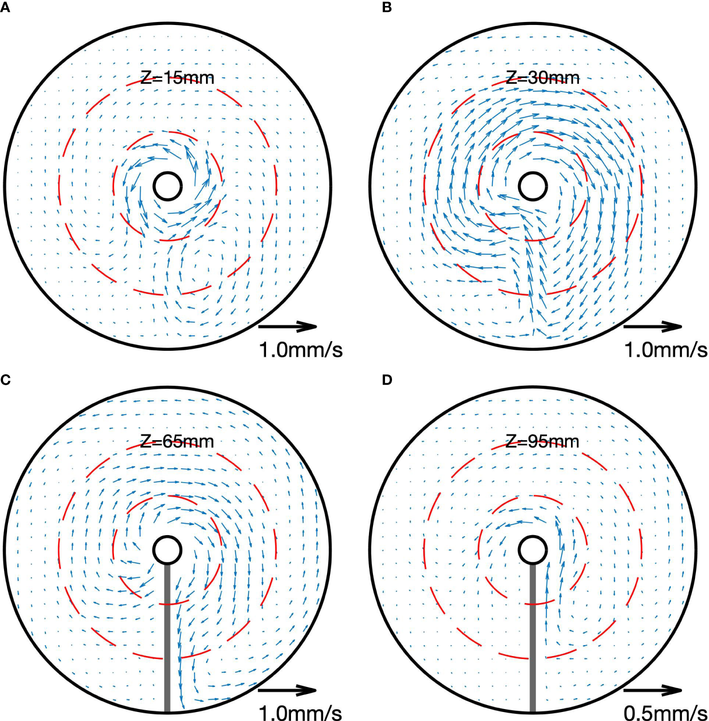 Velocities of the fluid were measured with two sets of PIV (particle image velocimetry) systems, one for velocity measurement on the horizontal plane (Laser2 and CCD2 in Figure 1A) and the other for the vertical plane (CCD1 and Laser1 which was not shown in Figure 1A). Each PIV set consisted of a semiconductor laser with a power of 2 W at a wavelength of 532 nm and a digital CCD camera with a spatial resolution of 3296 × 2472 pixels for horizontal and 1920 × 1080 pixels for vertical respectively. Lasers with necessary optical components were used to produce a green light sheet with a thickness of 3 mm. The working fluid was seeded with silver-coated hollow glass spheres with a diameter of 0.01 mm. These particles that traverse the light sheet are nearly neutrally buoyant and could suspend in the fluid for over 200 hr. CCD cameras were used to acquire images, following which each pair of images could be translated into a velocity vector field. Motorized linear stages were used to traverse both lasers and cameras so that the velocity fields on horizontal/vertical planes could be measured as desired.