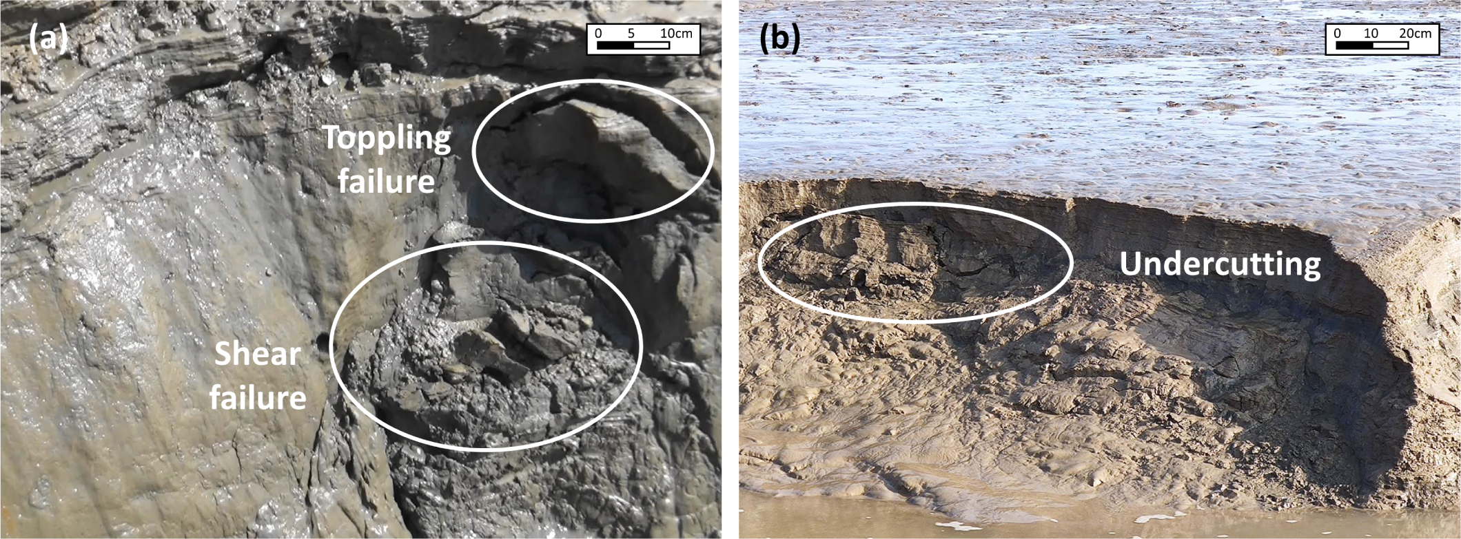Field photograph showing bank retreat process caused by seepage: (A) toppling and shear failure; (B) seepage undercutting. These photos were taken from Jiangsu coast, eastern China.