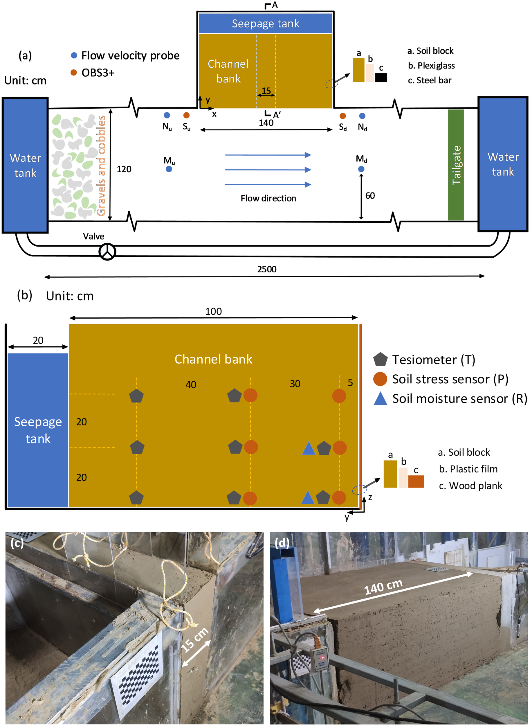 The soil collected from the field site was used to build the bank. To facilitate soil layer compaction, a wooden plate was set in front of the soil block. Also, a plastic film was arranged between the bank and the plate to reduce the friction of plate removal on the soil. In order to reduce the squeezing effect of the side wall of the plexiglass box on the soil (Fox et al., 2007), two extractable plexiglass boards were arranged on both sides of the bank (Samadi et al., 2013). After the completion of the bank model, the plate in front of the bank and the plexiglass boards on both sides were carefully removed. The bank was successively built by creating a series of specified weight 20- cm‐high layers, and the soil layer was compacted with a hand hammer. Each layer was left under self‐gravity for about 16 h after compaction to allow for sufficient drainage and consolidation. Two checkerboards made of ceramic were set at the top and in front of the bank in order to estimate bank deformation and retreat more accurately and conveniently. Figures 2C, D show the example of the completed 2D and 3D experimental models.