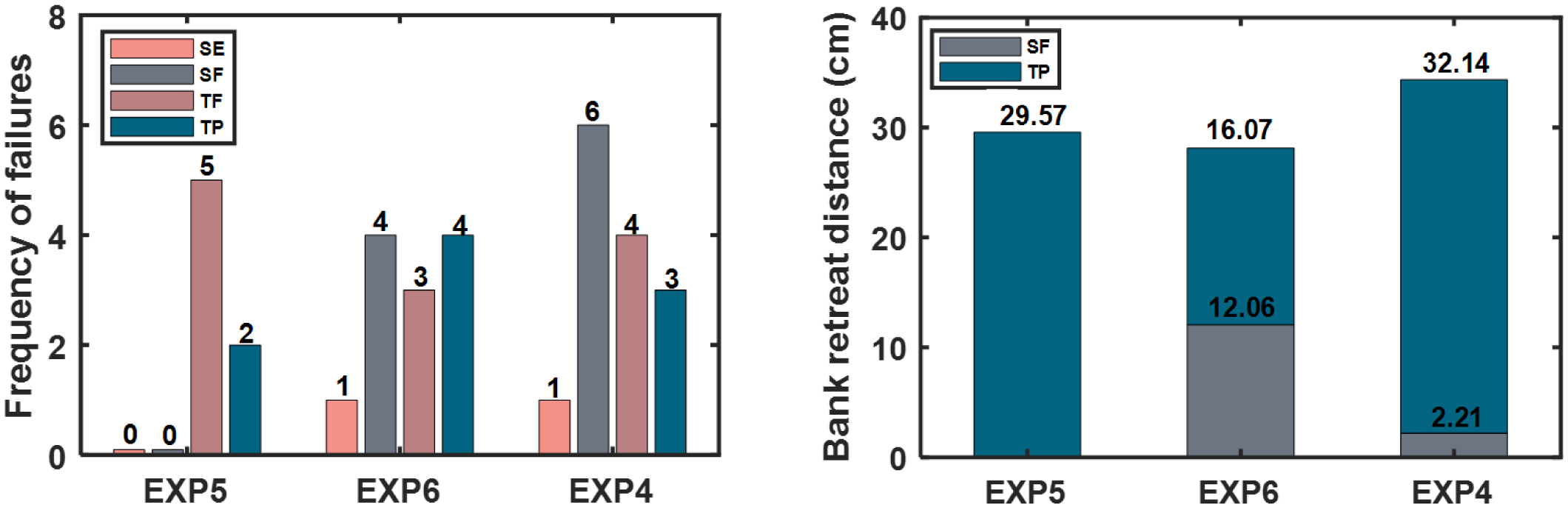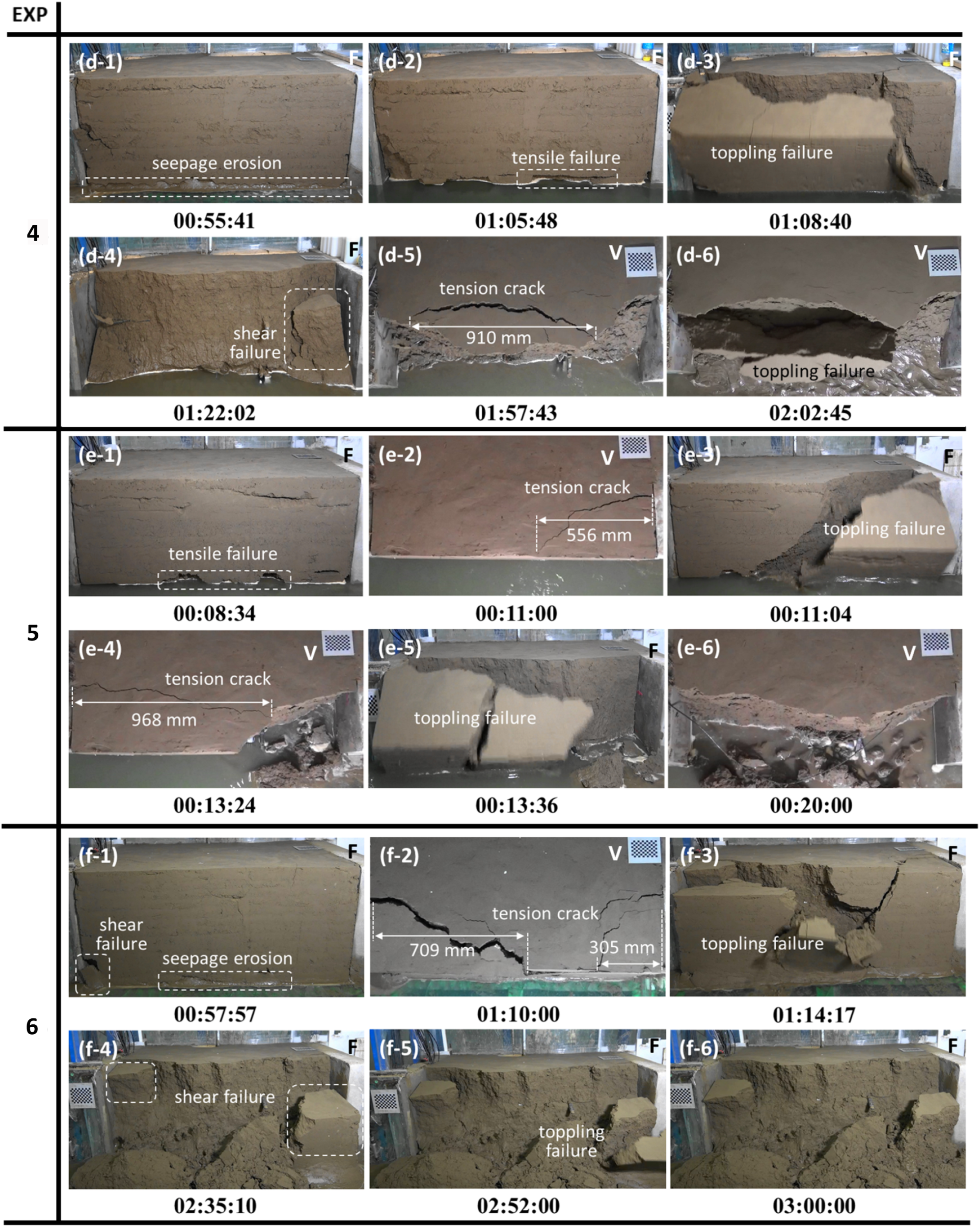 The failure process during each experiment is recorded by two cameras located on the front and above of the bank (Figures 3 and 4). The type and timing of bank failures of each experiment were recorded in Table 4.