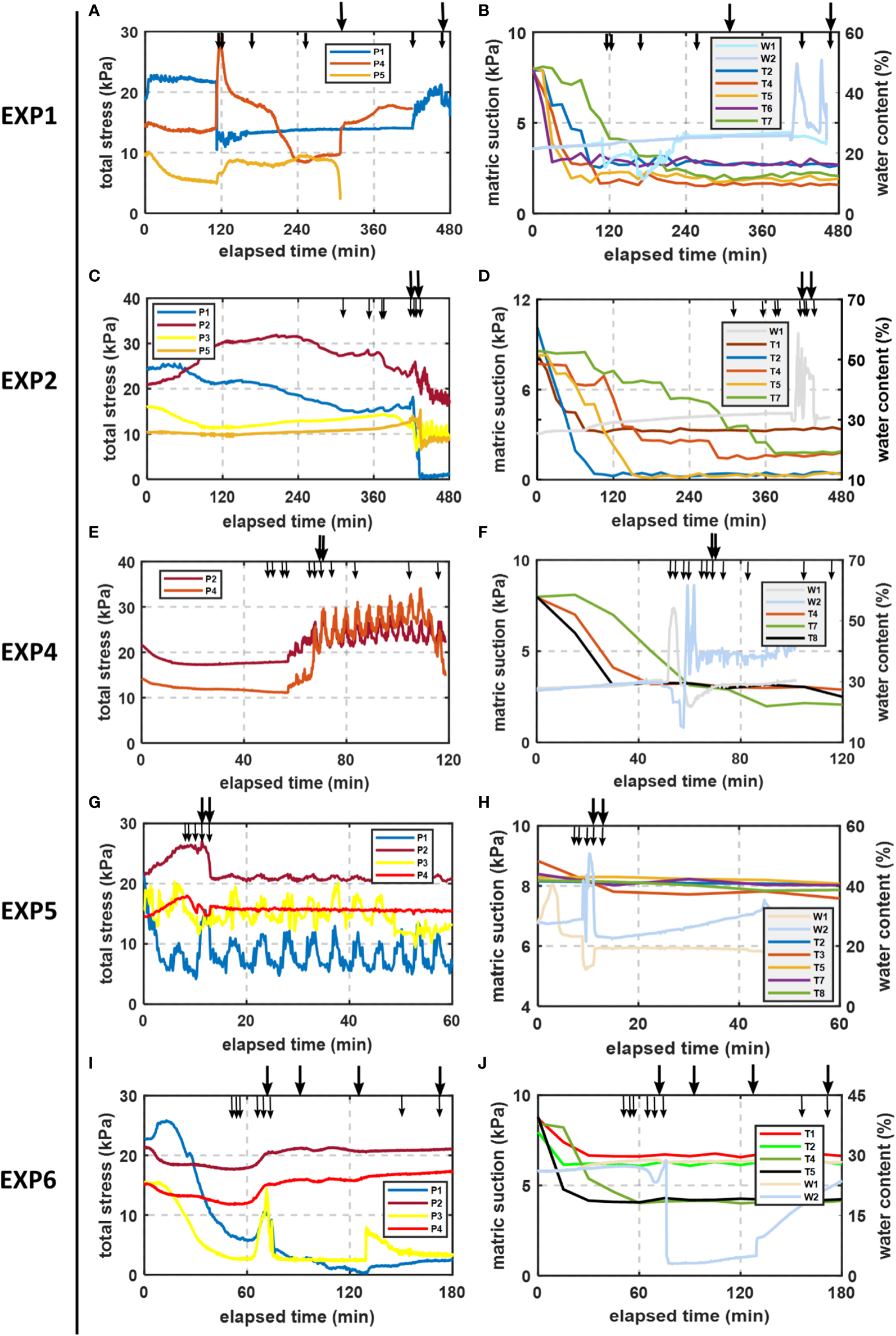 Soil or water monitoring probes were not set in EXP 3. X and Y, planimetric coordinates (see Figure 2A); Z, elevation above the bottom of the bank (Figure 2B). P, soil stress sensors measuring total stress; W, soil‐moisture sensors measuring water content; T, tensiometers measuring matric suction; N and M, flow velocity probes measuring flow velocity; S, OBSs measuring SSC.