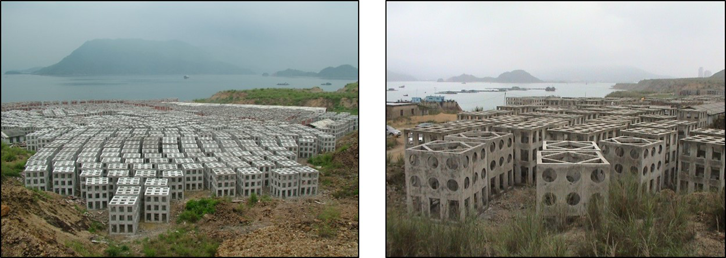 Reinforced concrete artificial reefs (3 × 3 × 5 m) laid on the seafloor in the artificial reef area of Dalajia.