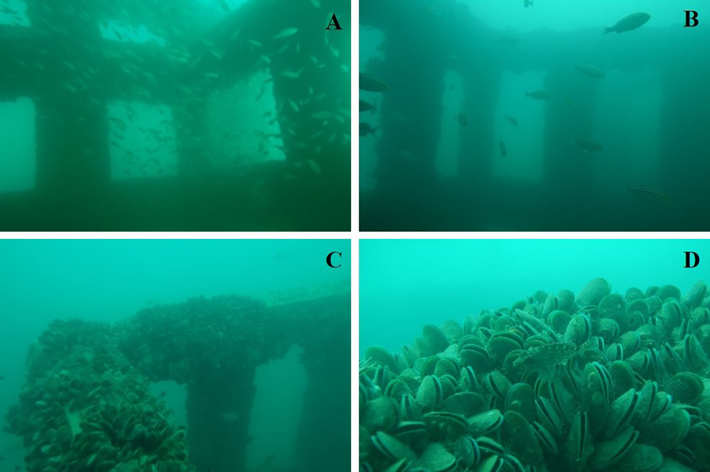Underwater photos of fish aggregation in artificial reefs (A, B) and living organisms attached to reefs (C, D) in Dalajia, Daya Bay, China.