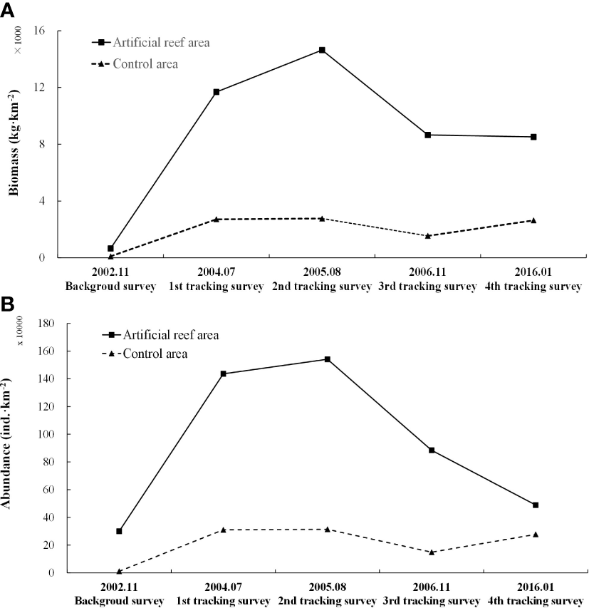 The nekton community was sampled in November 2002 before constructing the AR (background survey). Four tracking surveys were conducted in July 2004, August 2005, November 2006, and January 2016. The nekton community in both AR and CA habitats were sampled simultaneously during these periods.