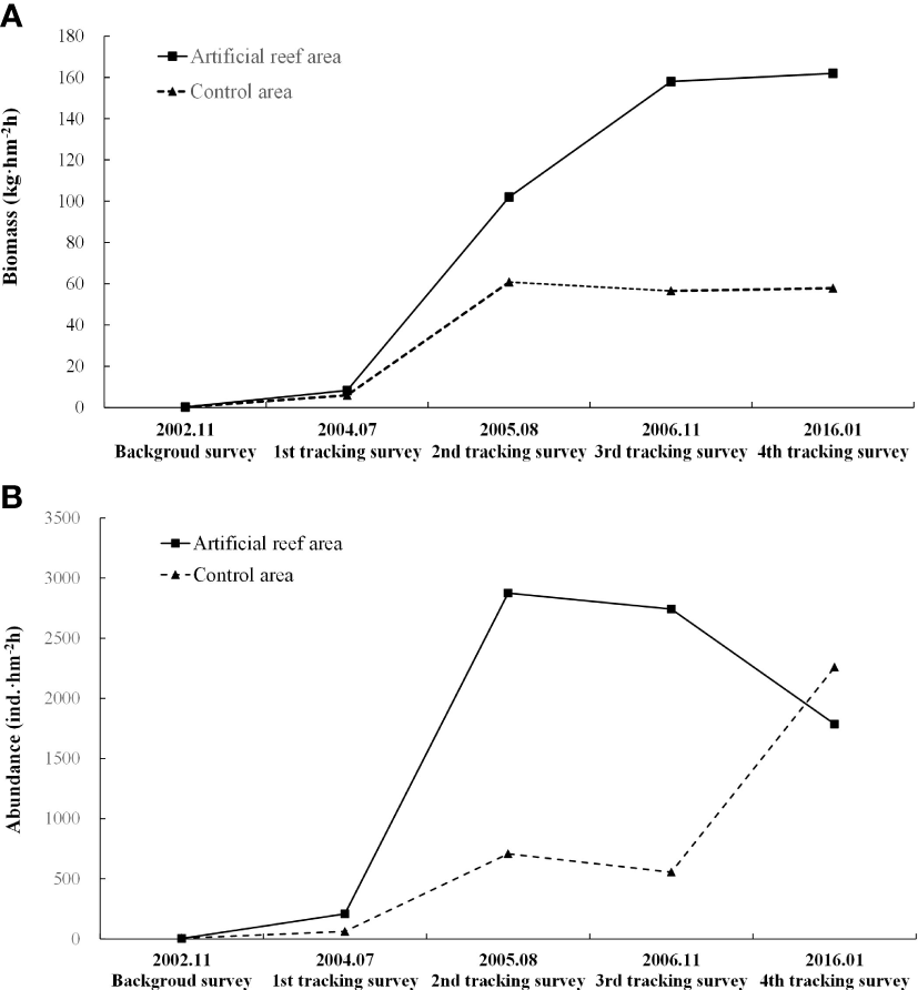 In the present study, based on the fishery resources data surveyed for 14 years (2002–2016) after AR construction, we assessed the effect of AR construction on the community composition, dominant species, taxonomic diversity, and eco-exergy of the nekton community in Dalajia, Guangdong, China. We compare the dynamics of these indicators to answer the following questions: (1) How did the community composition and dominant species of fishery resources change during the 14 years after AR construction? (2) How did the biomass and abundance of fishery resources and taxonomic diversity change during the 14 years after AR construction? (3) How did the eco-exergy of the nekton community change during the 14 years after AR construction? We examined the proliferation of fishery resource in the AR area over a relatively long duration and tracked, observed, and analyzed the sustainable impact of the AR on fishery resource conservation.