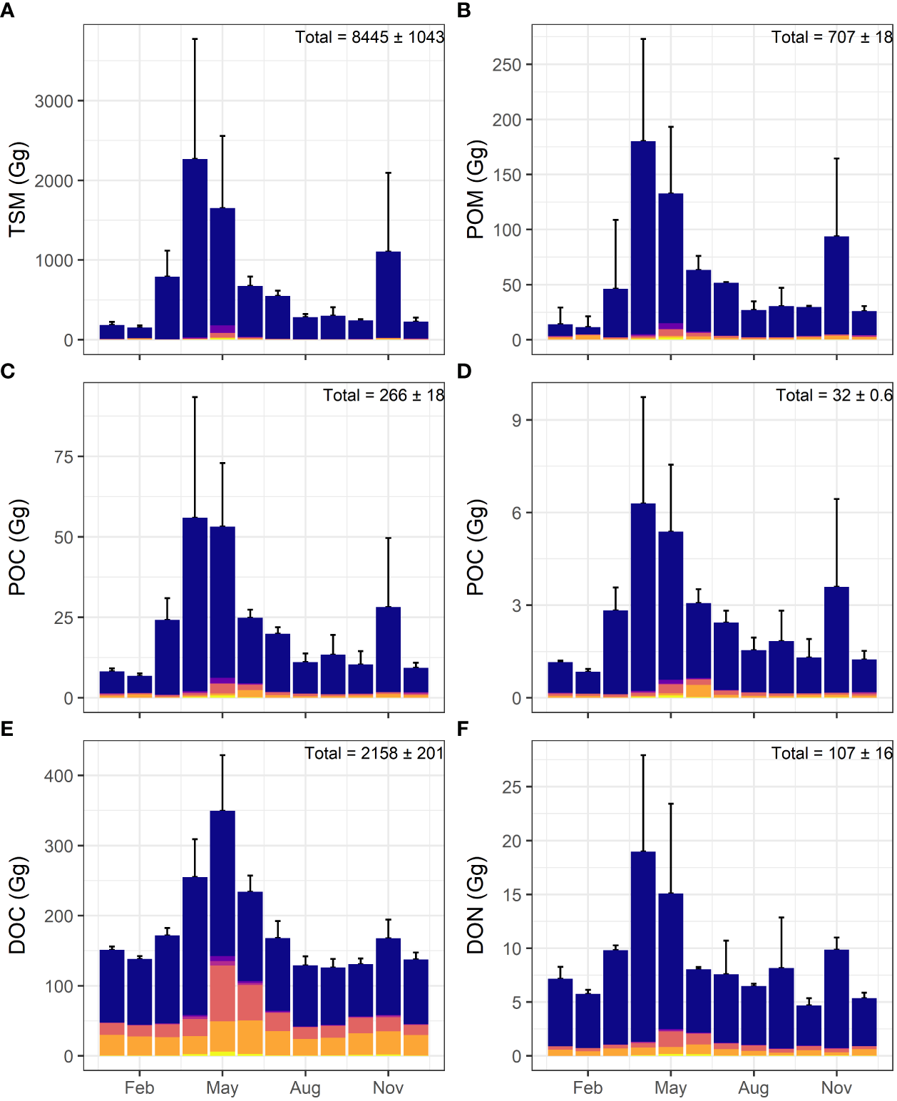 Stacked barplots of St. Lawrence estuary tributaries mean loadings (bars) and cumulative standard deviation (error bars) of (A) TSM, (B) POM, (C) POC, (D) PON, (E) DOC, and (F) DON for 2016–17. From top to bottom: blue = St. Lawrence River, purple = Northshore-USLE tributaries, fuchsia = Southshore-LSLE tributaries, coral = Saguenay River, orange = Northshore-LSLE tributaries, yellow = Southshore-LSLE tributaries.