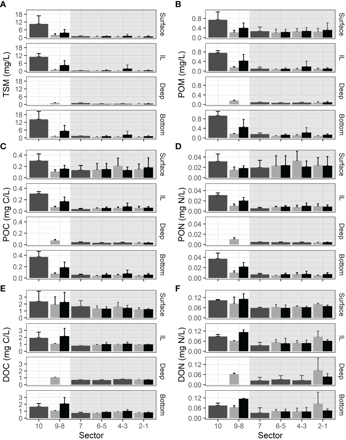 Concentrations (mean ± sd calculated for three time periods) of (A) TSM, (B) POM, (C) POC, (D) PON, (E) DOC, and (F) DON for the St. Lawrence estuary in 10 sectors, for each depth class. Dark gray = whole cross-section, pale gray = north of thalweg, black = south of thalweg. White background = USLE (downstream of the maximum turbidity zone), and gray background = LSLE. The depth of the USLE only reach the deep layer in sector 9.