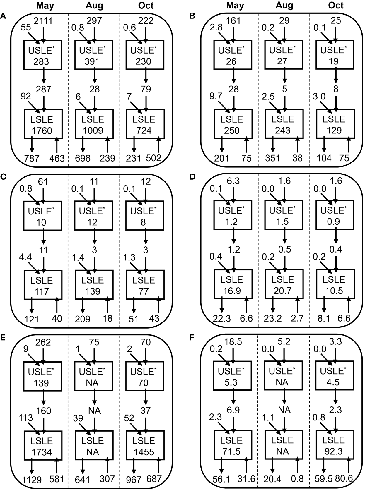 To compare the transport of TSM and organic matter between May, August and October, net transport was calculated for USLE and LSLE separately. Net transport is the difference between total inputs and outputs. The atmospheric deposition was considered negligible (< 1%) (Pocklington, 1986). A positive net transport value implies either an increase of the inventory or internal loss (e.g., sedimentation, respiration, removal of biomass, denitrification). A negative net transport value is associated to a decrease of the inventory or internal production (e.g., primary production).
