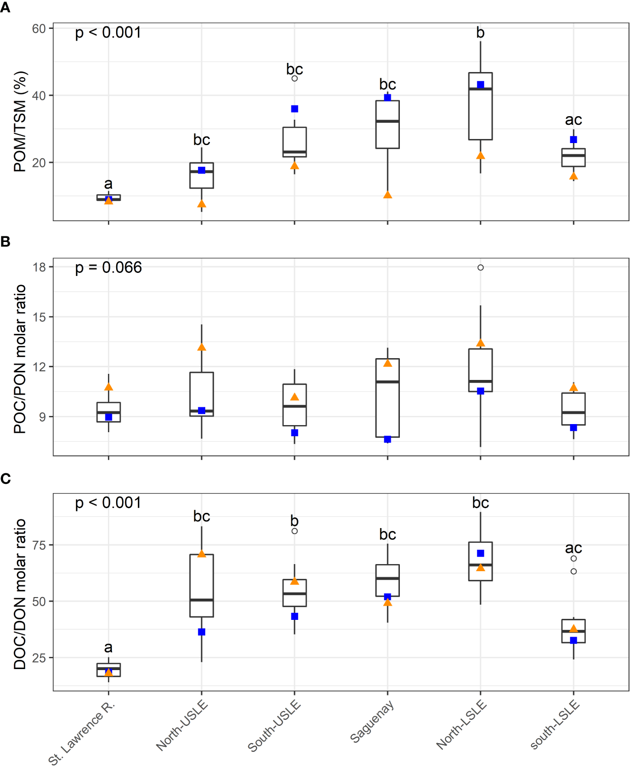 To exemplify the important upstream–downstream differences arising between USLE and LSLE, the nonparametric Wilcoxon rank test was applied in the comparison of particulate, dissolved, and ratios of OM. Furthermore, trends between ratios and distance from Quebec City were tested with linear regressions as a significant slope could be indicative of OM transformation and non-conservative processes.