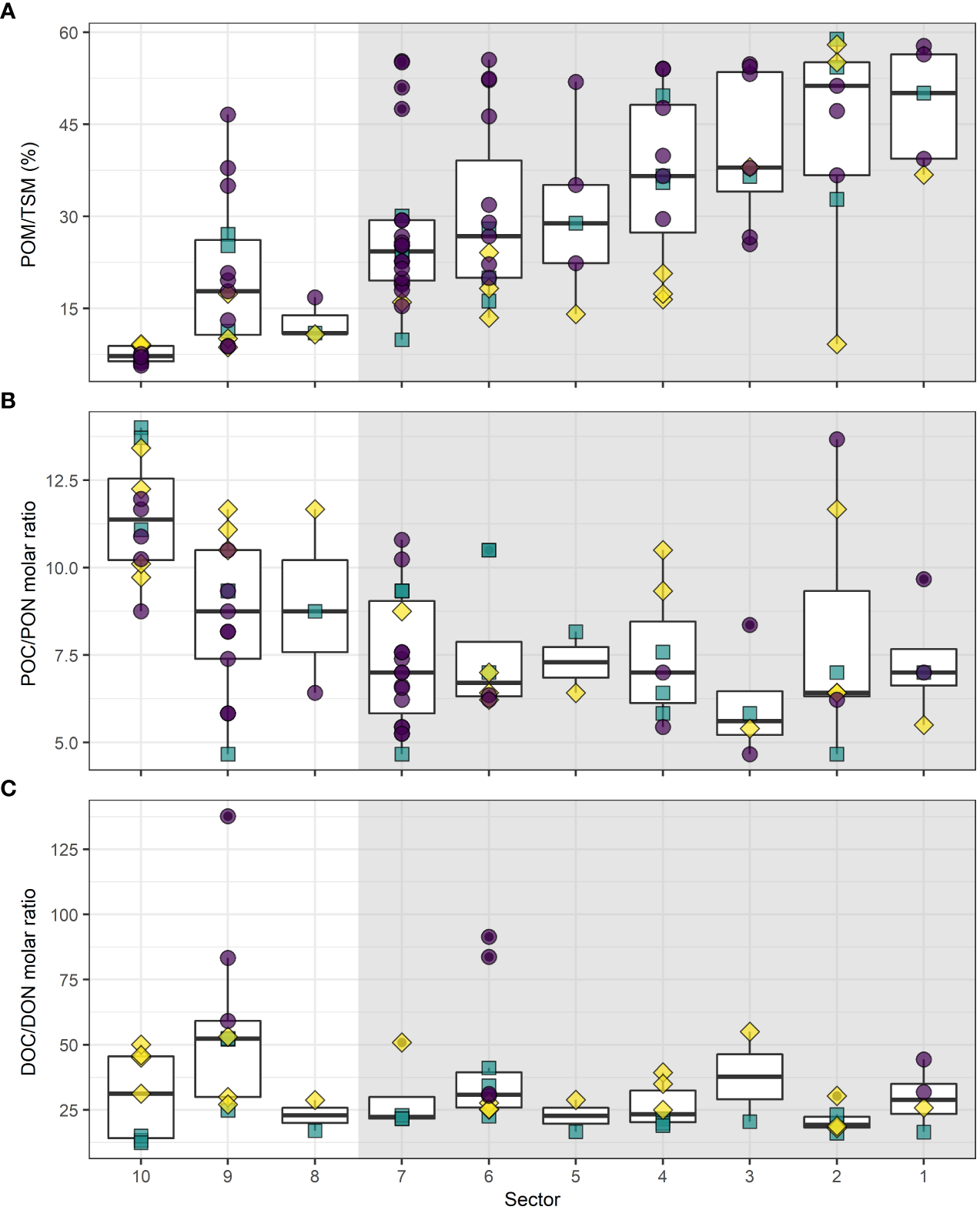 For instance, estuarine organic matter can be rapidly respired or degraded in surface waters stimulating concurrent primary production through newly generated and transported nutrients (Bauer et al., 2013; Fichot and Benner, 2014). In turn, the mixing of the different sources of organic matter has a direct influence on the magnitude of the primary and secondary production and its potential export to the aphotic layer through the interaction of biological and physical processes (Ducklow et al., 2001). The large amount of organic matter transported by tributaries toward the sea undergoes active exchanges between dissolved and particulate phases and transformation along the increasing salinity gradient. Biodegradation, photodegradation, flocculation, precipitation/dissolution are key intrinsic processes changing organic matter nature throughout its course from tributaries to the sea (Massicotte et al., 2017; Berggren et al., 2022). As a result, the composition of particulate and dissolved organic carbon (POC and DOC, respectively) and nitrogen (PON and DON, respectively) is modified at different rates resulting in changes in POC/PON and DOC/DON ratios, (i.e., preferential remineralisation of N leading to higher ratios as OM ages; Bianchi and Canuel, 2011). Additionally, origin of OM can be investigated as terrestrial OM generally possessed higher POC/PON and DOC/DON ratios than their marine counterpart (Aitkenhead and McDowell, 2000).