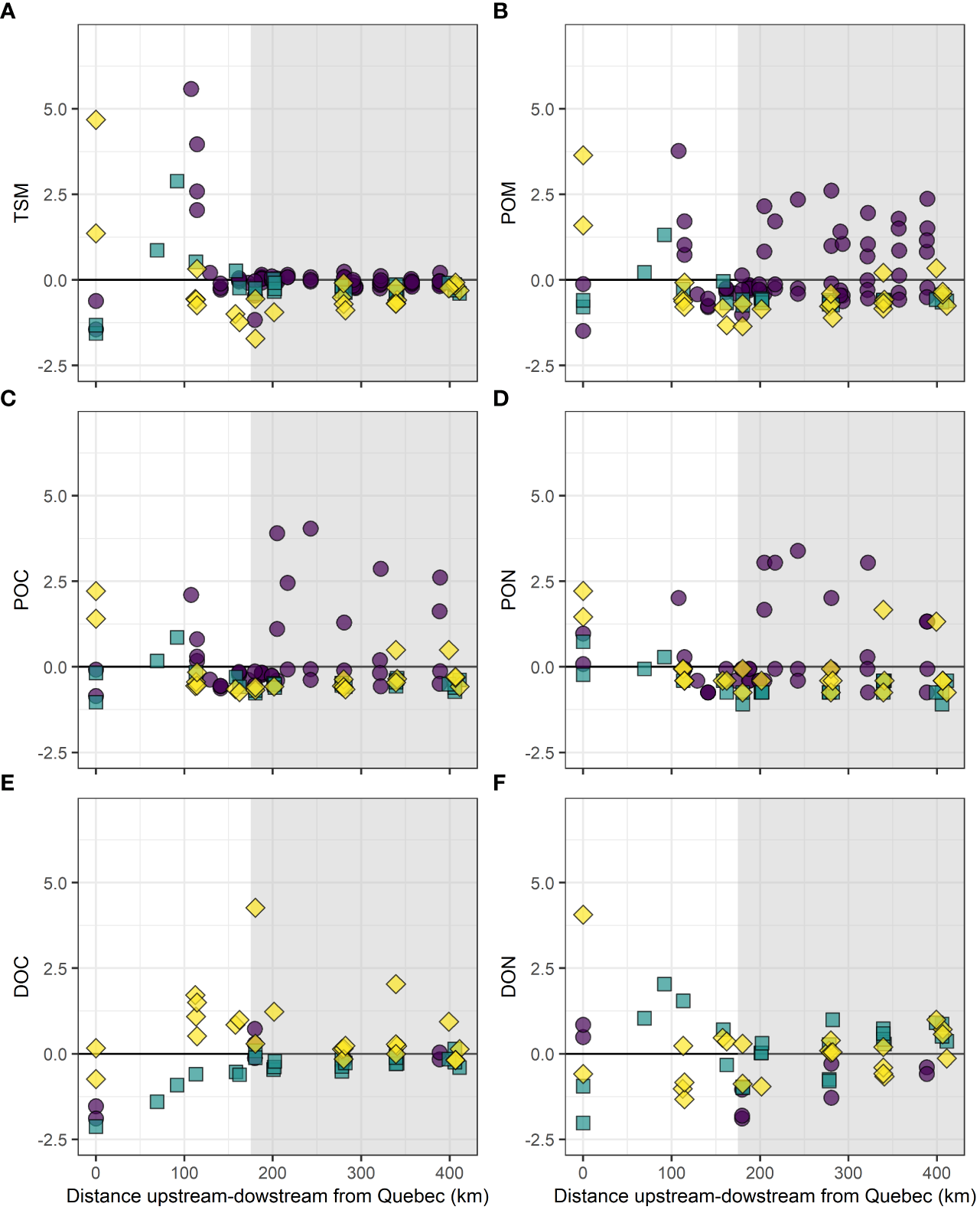 Since circulation in the SLE is complex and influenced by multiple tributaries, a simple two-endmember mixing model is not appropriate to evaluate how concentrations of TSM, POM, POC, PON, DOC, and DON deviated from the expected conservative mixing values along the estuarine gradient. Instead, a first order approach was applied, based on linear regression, similar to what has been previously used in the Wadden Sea (Seidel et al., 2015), Baltic Sea (Seidel et al., 2017), and in a subtropical estuary (Mori et al., 2019) to investigate this deviation. Briefly, each variable was regressed against practical salinity. If a linear trend was detected at an alpha level of 0.05, deviation patterns were examined in the standardized residuals along distance from Quebec City. If no linear trend was found, data were standardized by subtracting the mean and by dividing by the standard deviation (also termed z-score or standardised score). Both procedures yield unitless values where one unit represents a standard deviation. Moreover, since the salinity effect, and as a corollary the effect of tides, is removed from the data, it is possible to visualise them along the upstream–downstream distance from Quebec City. Standardized values close to zero are associated with a conservative behaviour while positive or negative values can be related to either production and removal, respectively, or by input of water with different TSM and organic matter concentrations.