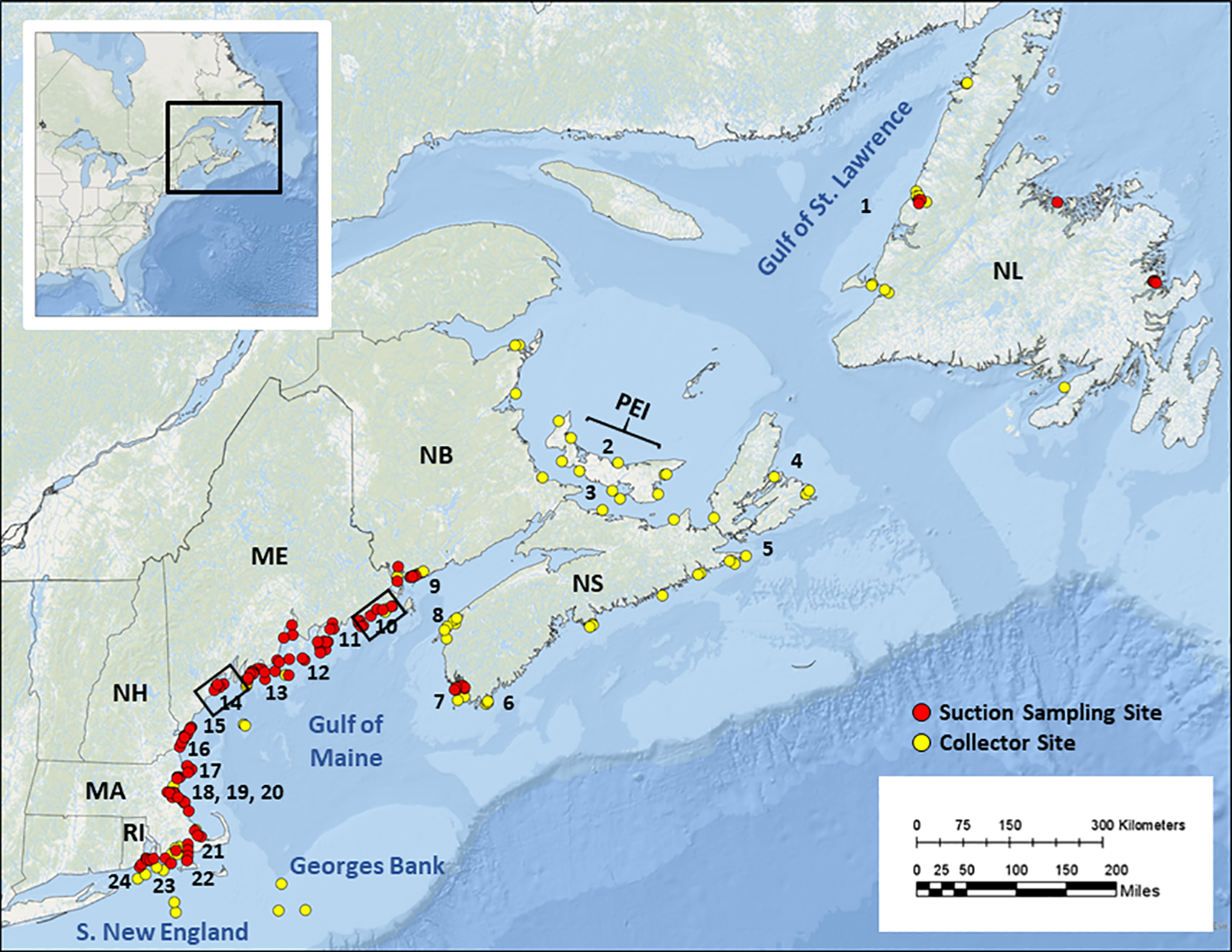 ALSI sampling sites in New England and Atlantic Canada using diver-based suction (red) and vessel-deployed collector (yellow) sampling locations. Inset map indicates coverage within eastern North America. Numbers correspond to study area descriptions and data presented in Supplement S2 and Figure 2. Abbreviations represent relevant geographic jurisdictions: Newfoundland (NL), Prince Edward Island (PEI), Nova Scotia (NS), New Brunswick (NB), Maine (ME), New Hampshire (NH), Massachusetts (MA), and Rhode Island (RI). Black rectangles denote collector deployment areas for deepwater settlement monitoring supported by Ready Seafood Co. in Maine.