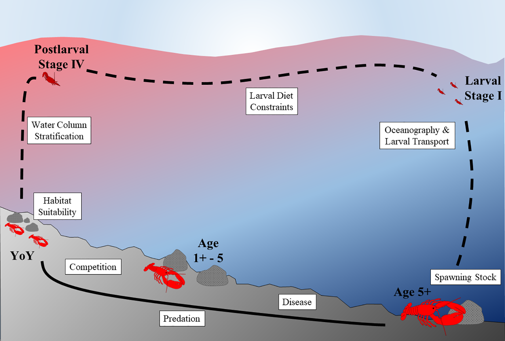 Upon settlement to the benthos, young-of-year lobsters are subject to a different suite of factors than the pelagic larval and postlarval stages. Several factors influence the number of settled lobsters that survive and recruit to the fishery and spawning stock (Figure 3). However, distinguishing which factors are most prominent in dictating post-settlement survivorship can be challenging, not only because of the many potential factors involved, but also because testing different hypotheses requires extensive time-series data of the life stages and covariates of interest. Ascribing causation to post-settlement mortality is of particular interest whether populations are in decline, as in southern New England, or growing and expanding, as in the eastern Gulf of Maine and the Gulf of St. Lawrence.