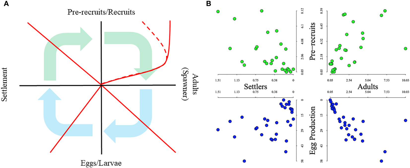 (A) Theoretical American lobster Paulik diagram adapted from Wahle (2004) between adult (spawners), pelagic stage (eggs/larvae), young-of-year (settlement) and pre-recruit or recruit lobsters. Arrows indicate the flow of life stages through the diagram for pre-settlement (blue) and post-settlement (green) stages. Red lines represent theoretical relationships between life stages. The solid and dashed lines for the upper right sub panel represent Beverton-Holt and Ricker stock-recruit functions. (B) Application of the Paulik diagram for American lobsters in southern New England (United States) with data from Rhode Island. Points represent relative abundance estimates by life stage and are colored by pre-settlement (blue) and post-settlement (green) stages. Details on data and methods can be found in Supplement S3.