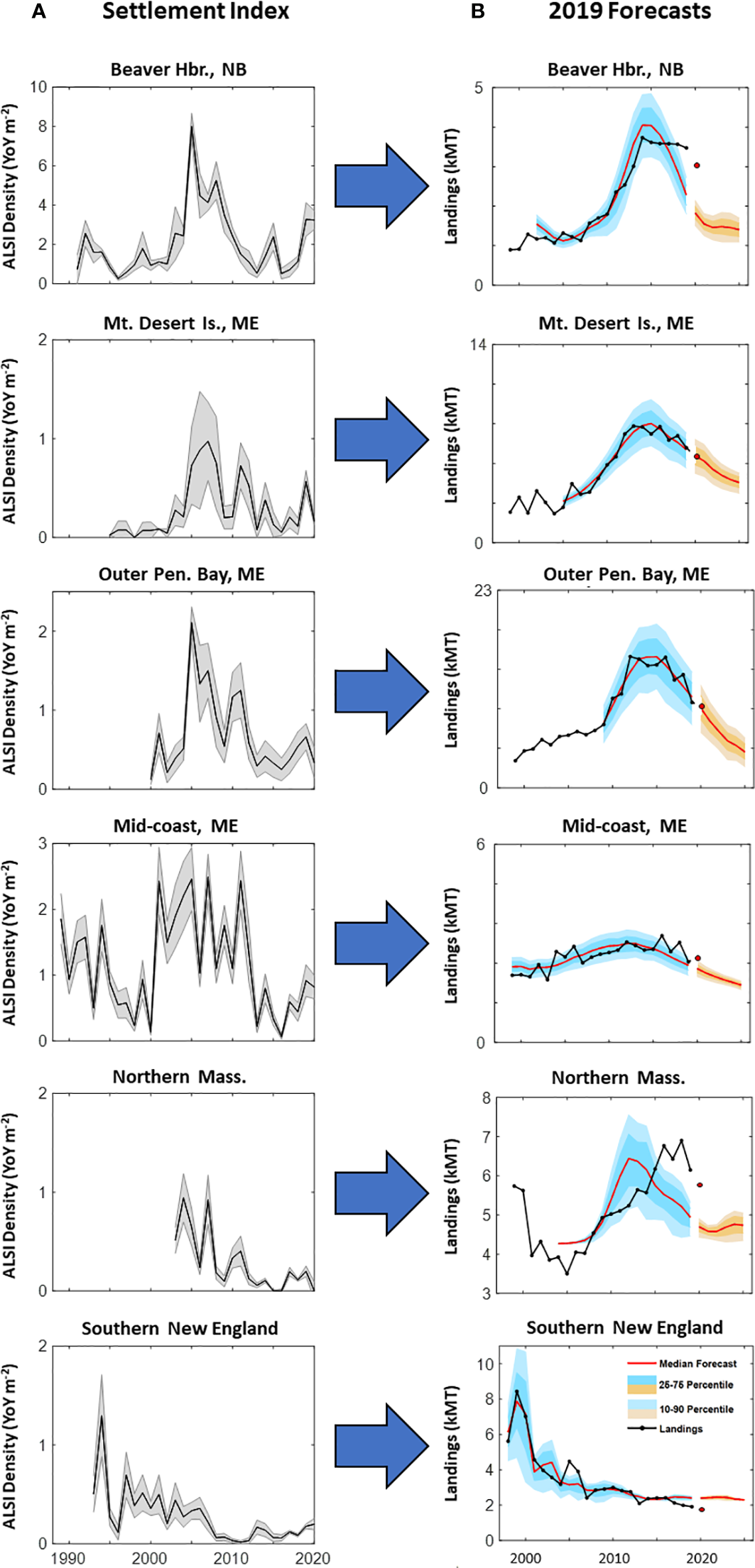 An ALSI-based forecasting tool is grounded in the idea that an accurate indicator of young-of-year abundance is likely to be a better predictor of subsequent recruitment to the fishery than indices of broodstock or larval abundance, because the cohort has already run the gauntlet and uncertainties of planktonic life (Wahle, 2003). Developing a forecasting tool faced several challenges. After quantifying the annual pulse of young-of-year abundance by way of suction sampling or vessel-deployed collectors, the next step was to deal with the inherent difficulties in projecting future trends of fishery recruitment for a long-lived species like the American lobster. The first challenge was to account for the fact that crustaceans are notoriously difficult to age, and while thermal regime can help predict lobster growth rates and therefore size at age, tremendous variability in growth are observed for the same thermal regime. This means that a given cohort of settlers will cross the legal-size threshold to recruit to the fishery over a range of ages, so that any year of fishery recruitment comprises a mix of ages (Oppenheim et al., 2019). The first predictive model (Wahle et al., 2004) began to account for that variability, but the forecasts were preliminary, spanned a relatively short time series, did not account for variable environmental conditions within an area, and were not validated against observed fishery recruitment or landings. In addition, as many studies have noted, the challenges of testing environmental effects on recruitment and survivor dynamics is that the correlations between them may not be stationary over time (Myers, 1998; Jacobson and McClatchie, 2013; Hare et al., 2015).