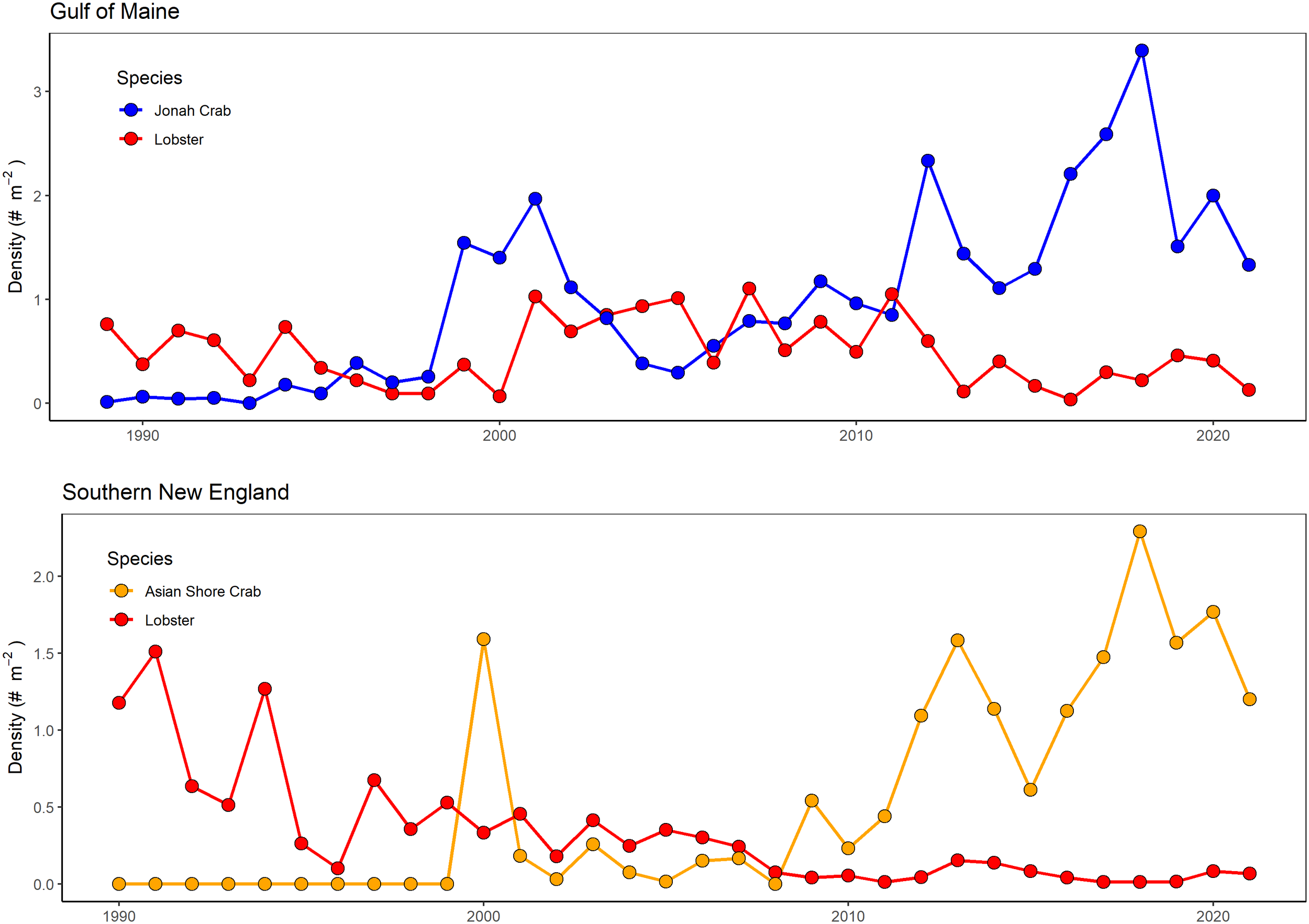 Depiction of emerging taxa in relation to young-of-year American lobster in US waters: Jonah crab in the Gulf of Maine (top) and Asian shore crab in southern New England (bottom). Gulf of Maine indices represent those from the Mid-coast Maine site and Southern New England indices are aggregated from Rhode Island and Buzzards Bay.
