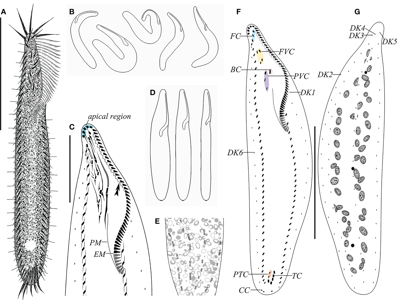 Morphology of Trachelostyla caudata from life (A–D) and after protargol impregnation (E–G). (A) Ventral view of an ideal representative individual. (B) Arrangement of extrusomes (dark shading). (C) Rod-like extrusomes. (D) Different cell shapes. (E) Detailed infraciliature of the anterior region. Double arrowhead shows zigzag fiber. (F, G) Ventral (F) and dorsal (G) views showing the ciliary pattern and the nuclear apparatus. BC, buccal cirrus; CC, caudal cirri; EM, endoral membrane; FC, frontal cirri; FVC, frontoventral cirri; PM, paroral membrane; PTC, pretransverse ventral cirri; PVC, postoral ventral cirri; TC, transverse cirri; DK1–DK6, dorsal kineties 1–6. Scale bar, 35 μm.