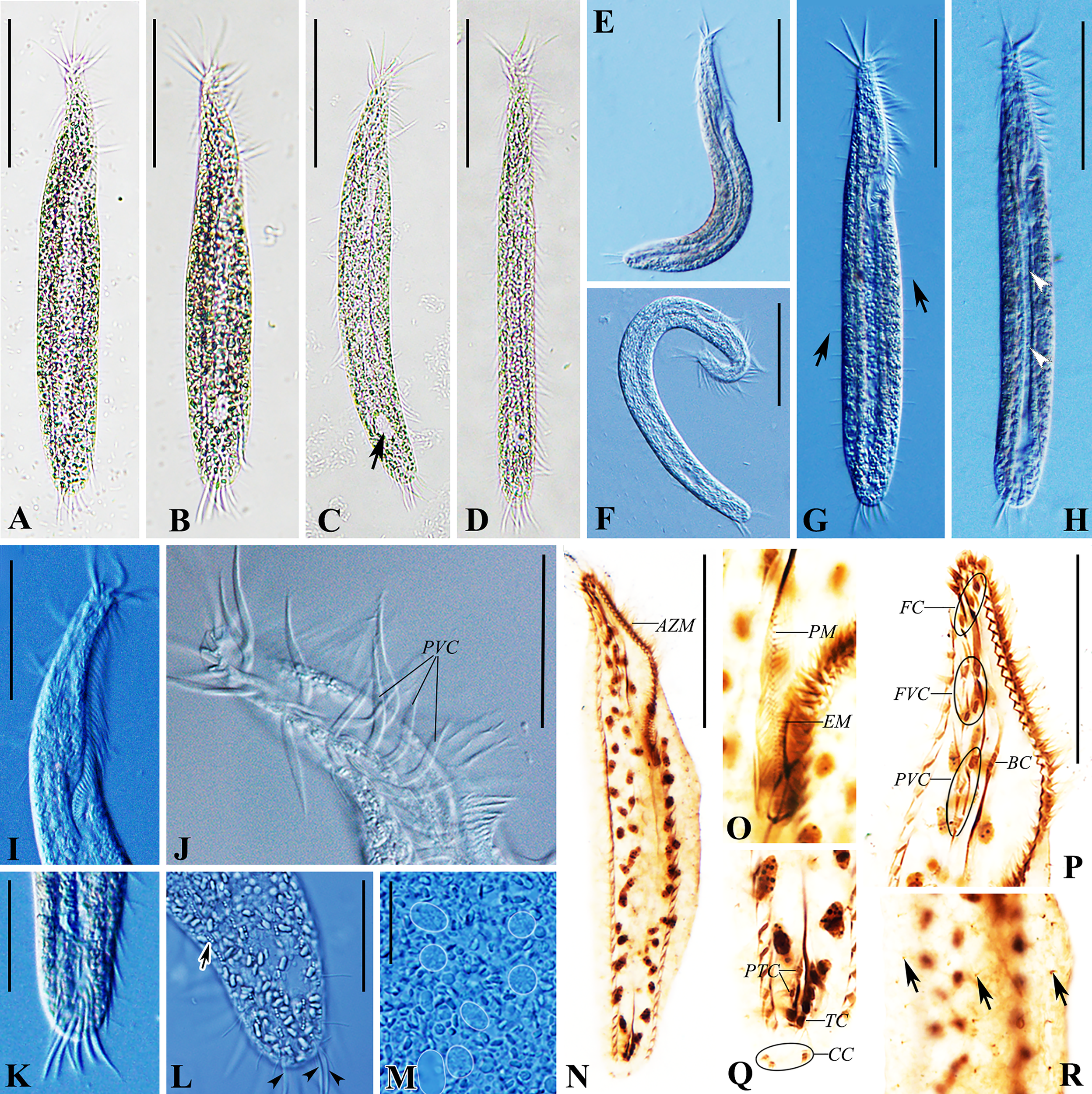 Trachelostyla aestuarina n. sp. from life [bright field (A–D) and differential interference contrast (E–M)] and after protargol impregnation (N–R). (A–H) Ventral views of individuals showing different cell shapes and degree of flexibility. Arrow in (C) marks the non-contractile vacuole, arrows in (G) mark the rows of dorsal bristles, and arrowheads in (H) show the longitudinal concavity of the cell. (I) Anterior section showing the shape of the adoral zone of membranelles. (J) Arrangement of cirri near the oral region. (K) Ventral view of the posterior section showing transverse cirri. (L) Dorsal view of the posterior section. Arrows indicate cortical granules, while arrowheads mark the caudal cirri. (M) Macronuclear nodules (white outlines added to 7 Ma). (N) Ventral view of the holotype showing the ciliary pattern and the nuclear apparatus. (O) Ventral view of the buccal region marking the undulating membranes. (P) Ventral view of the oral region. (Q) Ventral view of the posterior cell region. (R) Partial dorsal view. Arrows indicate dorsal bristles. AZM, adoral zone of membranelles; BC, buccal cirrus; CC, caudal cirri; EM, endoral membrane; FC, frontal cirri; FVC, frontoventral cirri; PM, paroral membrane; PTC, pretransverse ventral cirri; PVC, postoral ventral cirri; TC, transverse cirri. Scale bars, 60 μm (A–N), 30 μm (I, J, P), 25 μm (K, L), and 8 μm (M).