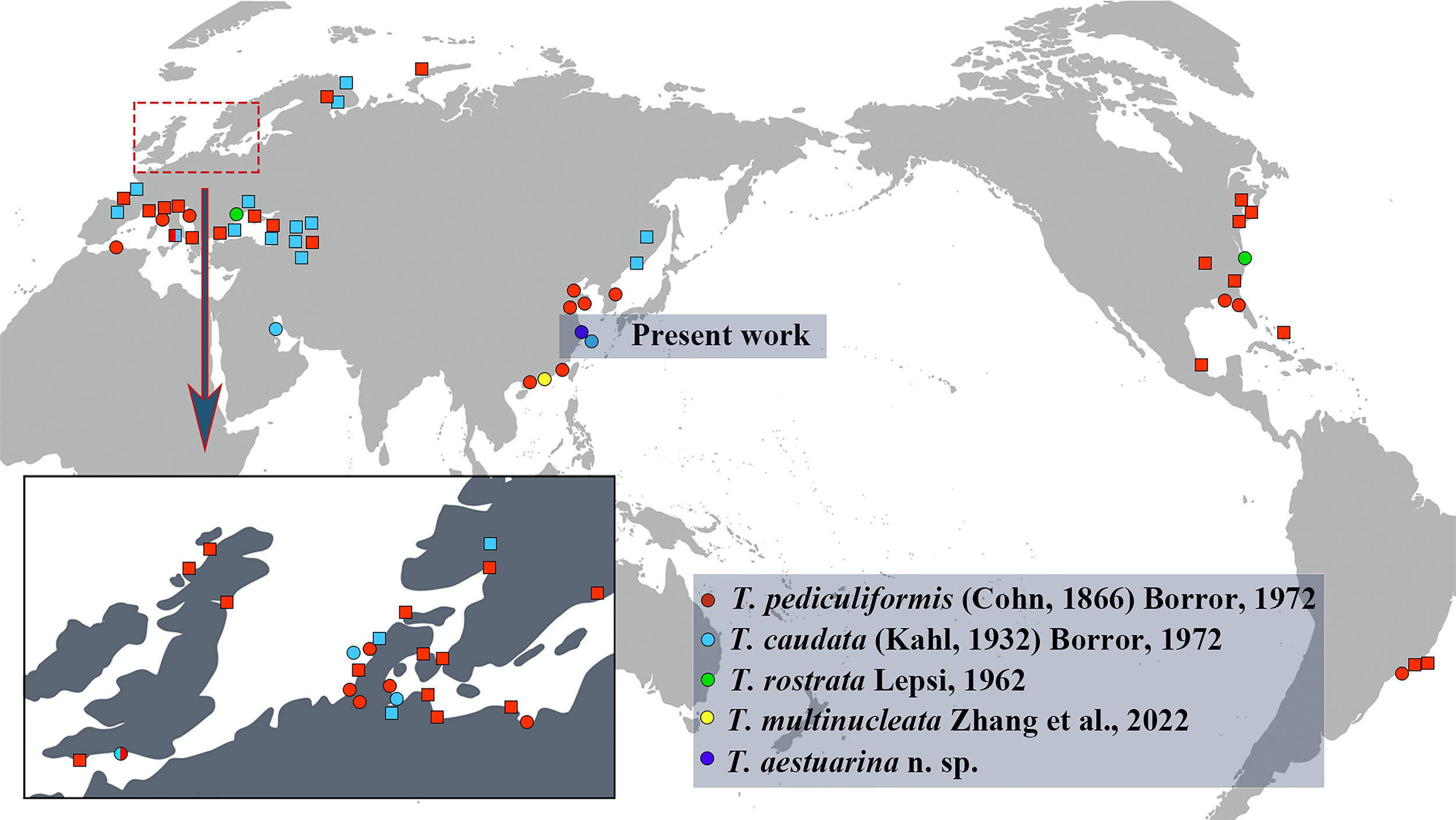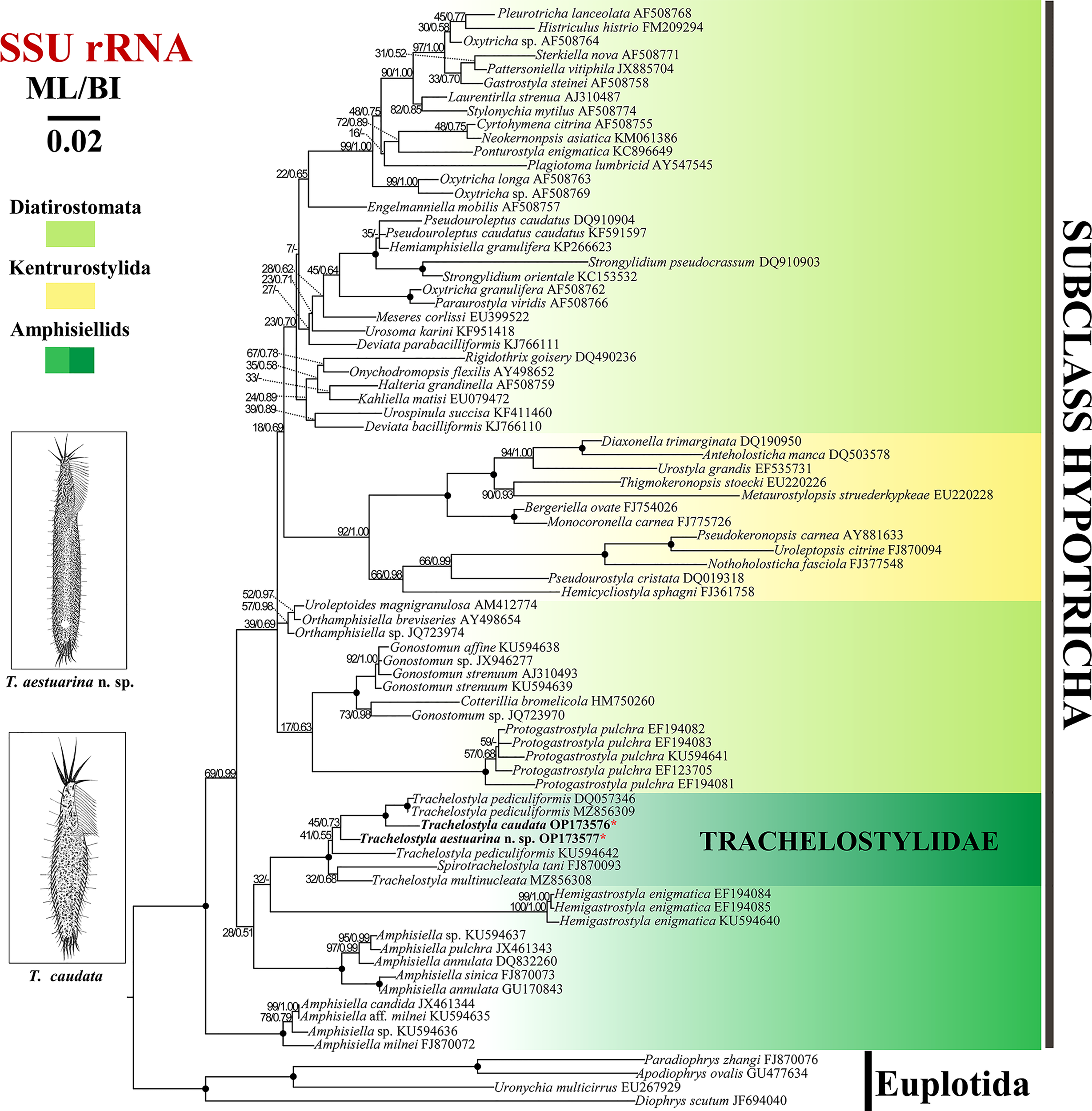 Here, we describe a new species of Trachelostyla, Trachelostyla aestuarina n. sp., and reinvestigate T. caudata based on a Chinese population, completing its ciliary analysis and physiological reorganization features. We also present their phylogenetic relationships inferred from small subunit ribosomal RNA (SSU rRNA) gene sequence data. Furthermore, a key to the identification of the five valid species is provided and the global biogeography of the genus Trachelostyla summarized based on previous reports and the data presented here.