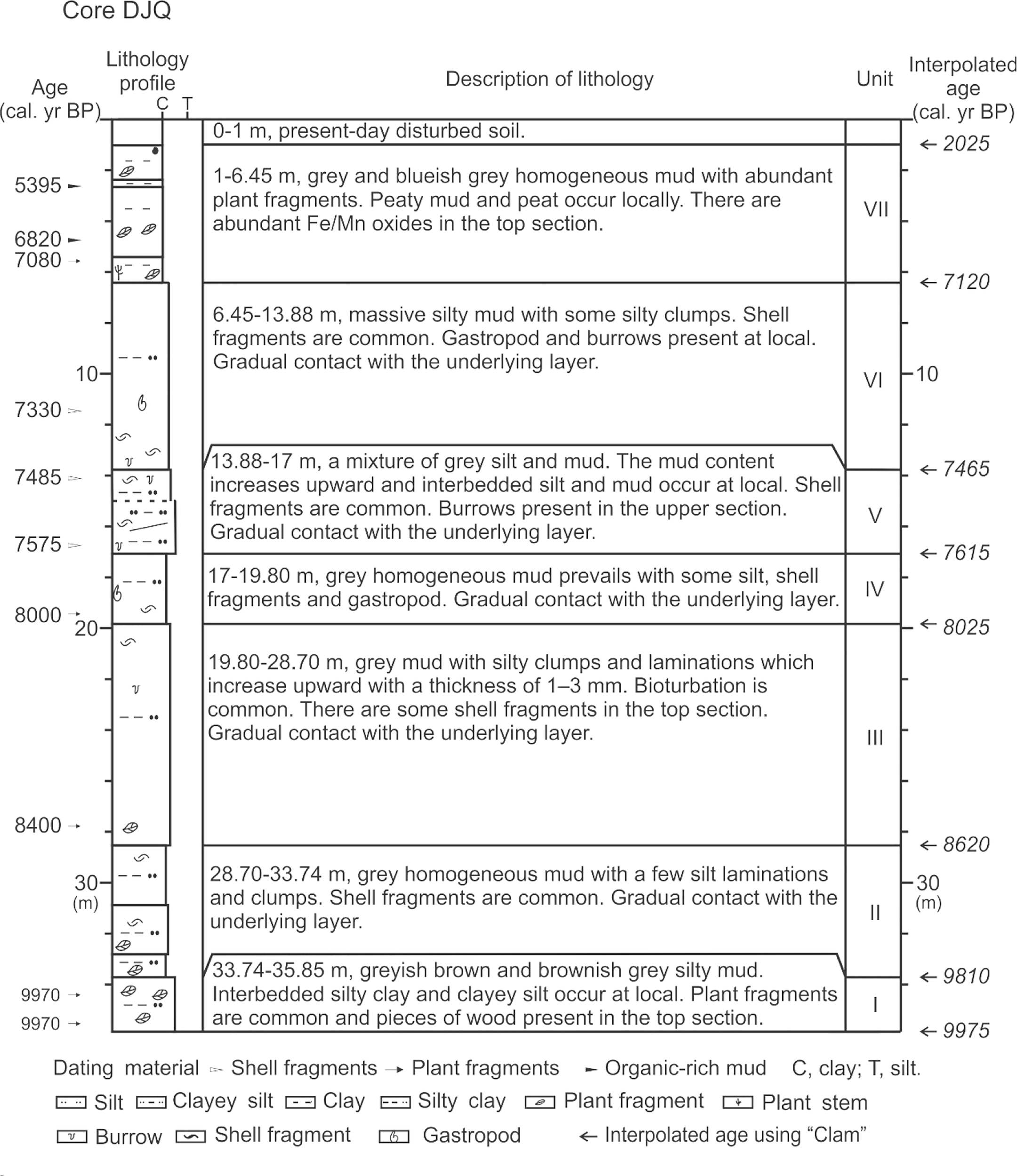 The muddy sediments above 35.85 m in core DJQ were divided into seven units from the base upwards according to lithological changes (Figure 5) and are described as follows.