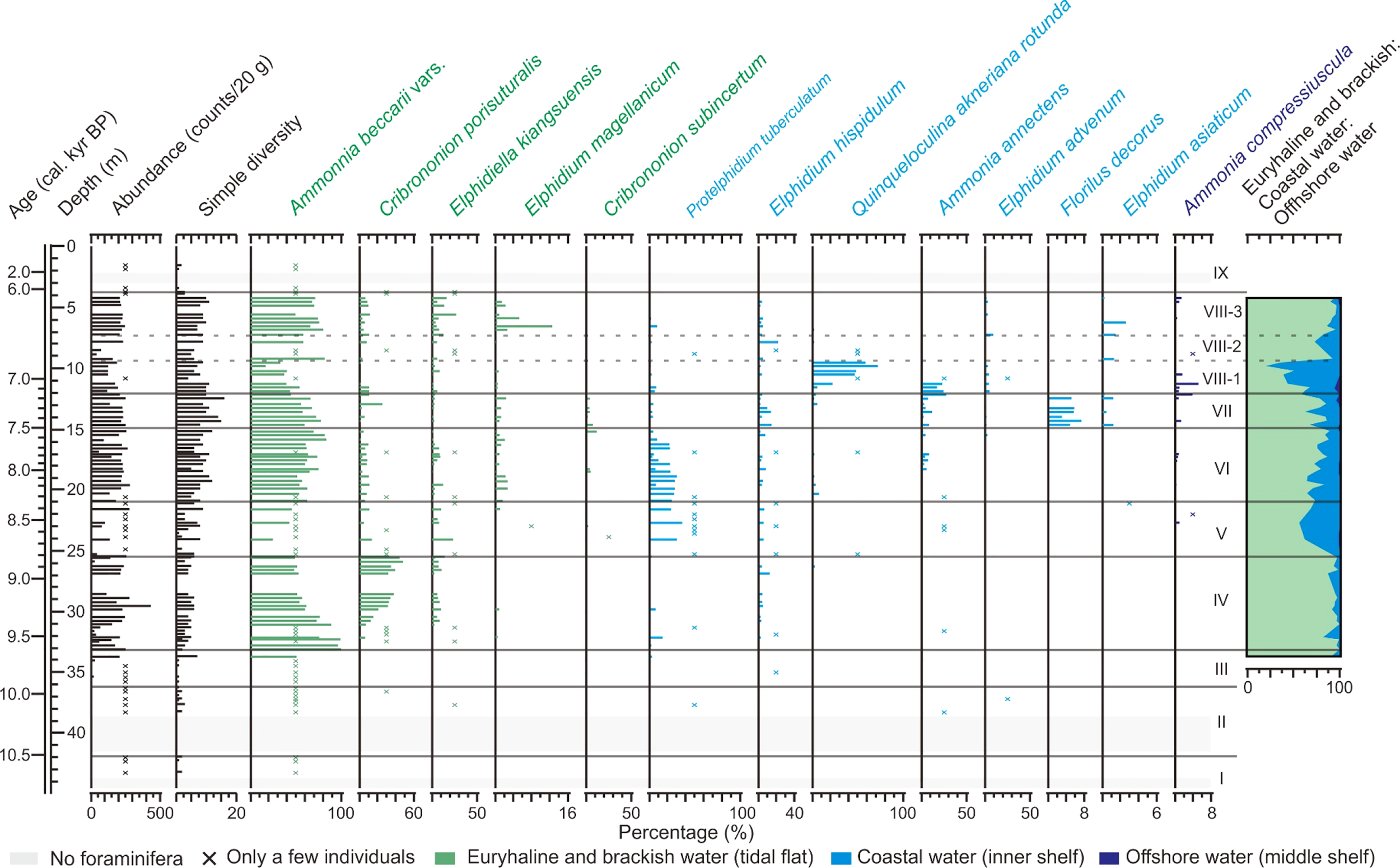 Unit IV (33.20–25.55 m; 9,620–8,815 cal. yr BP). Absolute abundance of individuals here is 220 counts/20 g and simple diversity (number of species) is 12. A. beccarii vars. has the highest relative abundance (67%), followed by C. porisuturalis (22%). Other common species include the brackish water E. kiangsuensis (5%) and coastal water E. hispidulum (3%) and P. tuberculatum (2%). Euryhaline and brackish water taxa account for the vast majority (95%), while coastal water taxa only account for 5%.