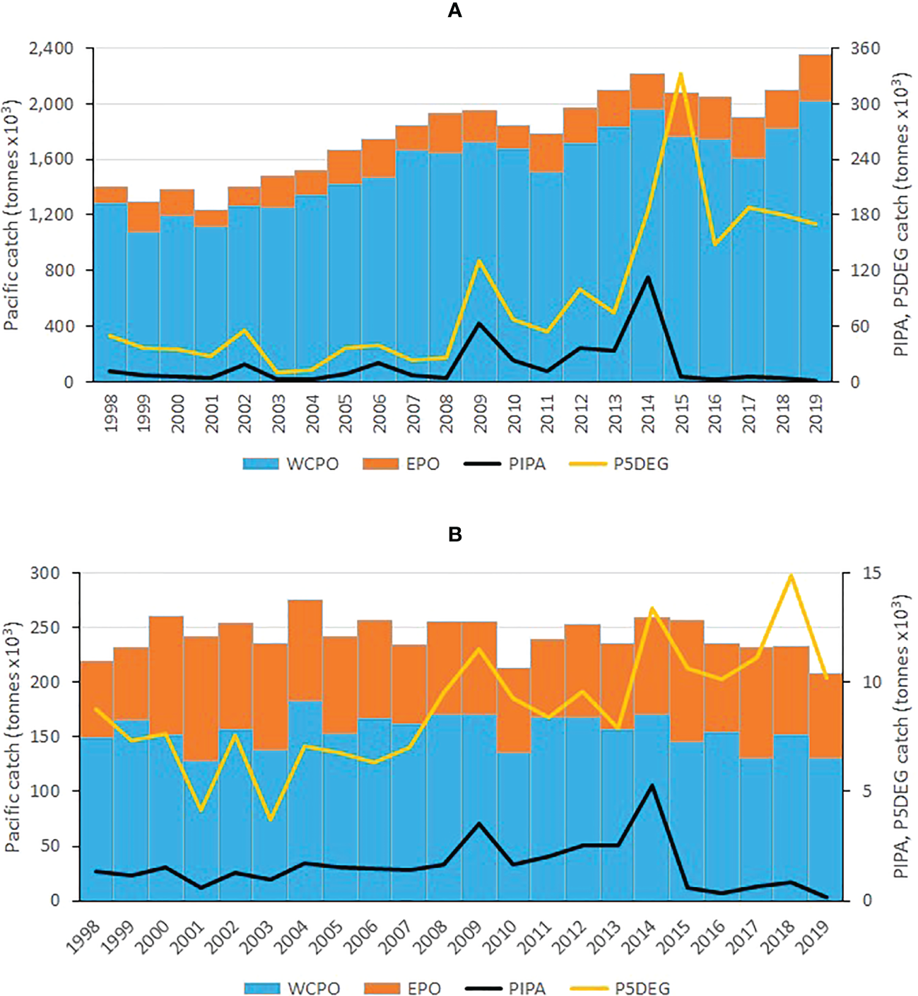 Skipjack (A) and bigeye (B) tuna annual catches in the western and central Pacific Ocean (WCPO, the Pacific Ocean west of 150°W), eastern Pacific Ocean (EPO, the Pacific Ocean east of 150°W), the Phoenix Islands Protected Area (PIPA) and the five-degree spill-over area surrounding the PIPA (P5DEG). See Figure 1 for the area definitions.