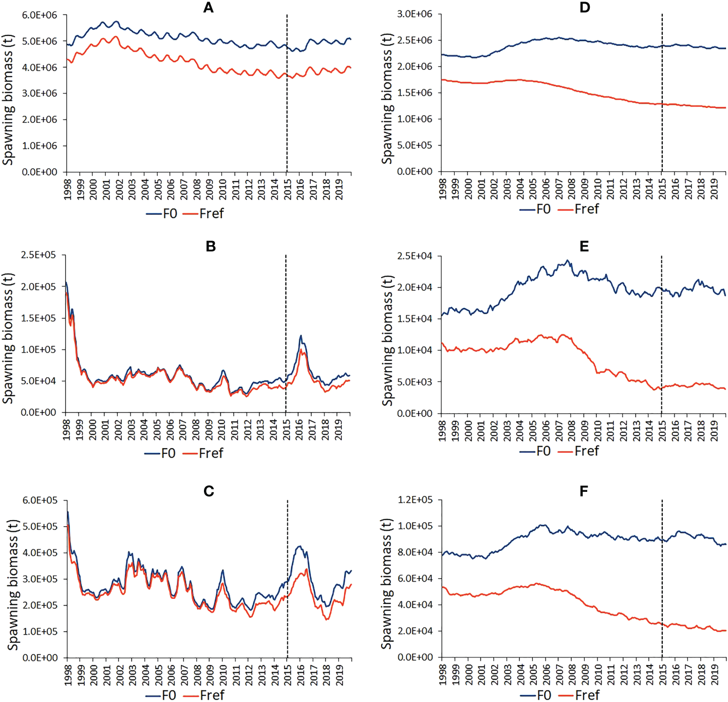Time series of estimated skipjack (A-C) and bigeye (D-F) tuna spawning biomass under the observed fishing activity (Fref) and in the absence of fishing (F0) in the western and central Pacific Ocean (A, D), in the PIPA (B, E) and in the PIPA five-degree spill-over area (C, F). The vertical dashed lines indicate the implementation of the PIPA closure.