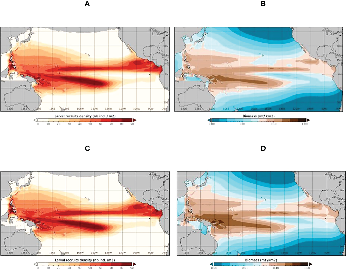 The SEAPODYM-simulated 1998-2019 average distribution of skipjack tuna larvae (A, C) and spawning biomass (B, D) under the observed (Fref) level of fishing (A, B) and under unexploited (F0) conditions (C, D).