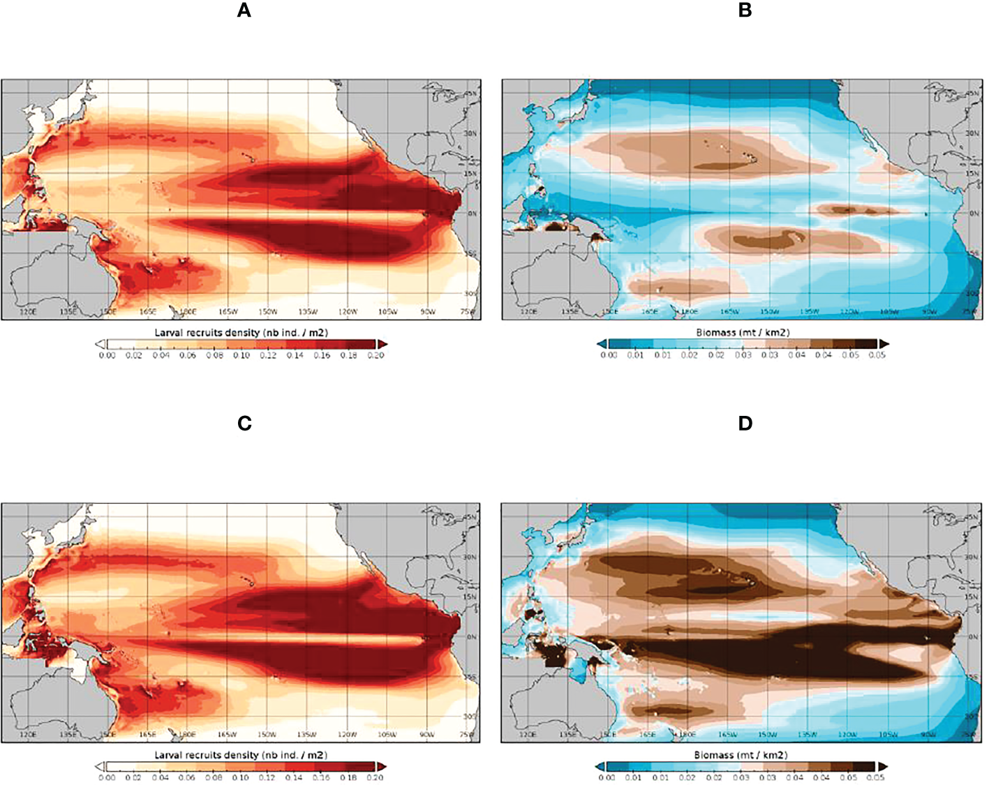 The SEAPODYM-simulated 1998-2019 average distribution of bigeye tuna larvae (A, C) and spawning biomass (B, D) under the observed (Fref) level of fishing (A, B) and under unexploited (F0) conditions (C, D).
