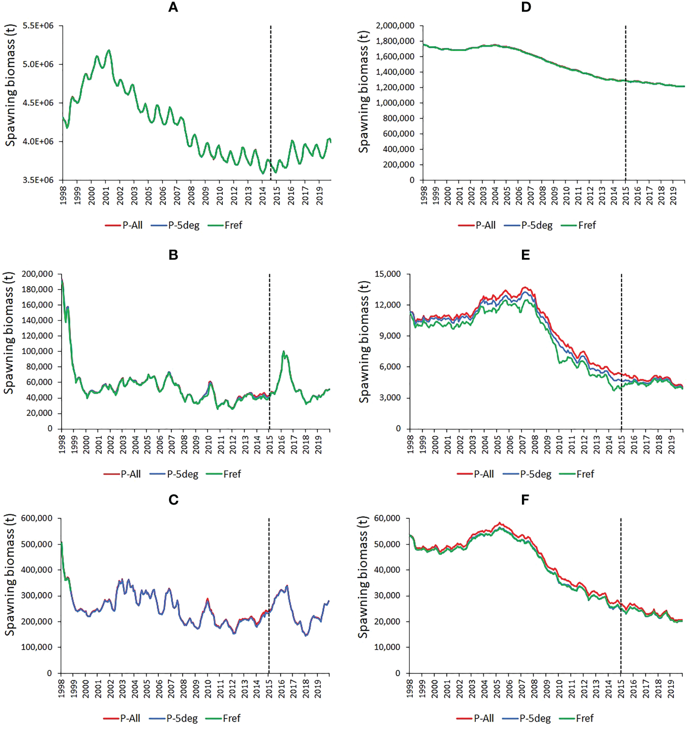Time series of estimated change in skipjack (A-C) and bigeye (D-F) tuna spawning biomass (SB) for the observed fishing activity (Fref) and for retrospective PIPA closures under two catch/effort redistribution assumptions (P-All and P-5deg) in the western and central Pacific Ocean (A, D), in the PIPA (B, E) and in the PIPA five-degree spill-over area (C, F). The vertical dashed lines indicate the implementation of the actual PIPA closure.
