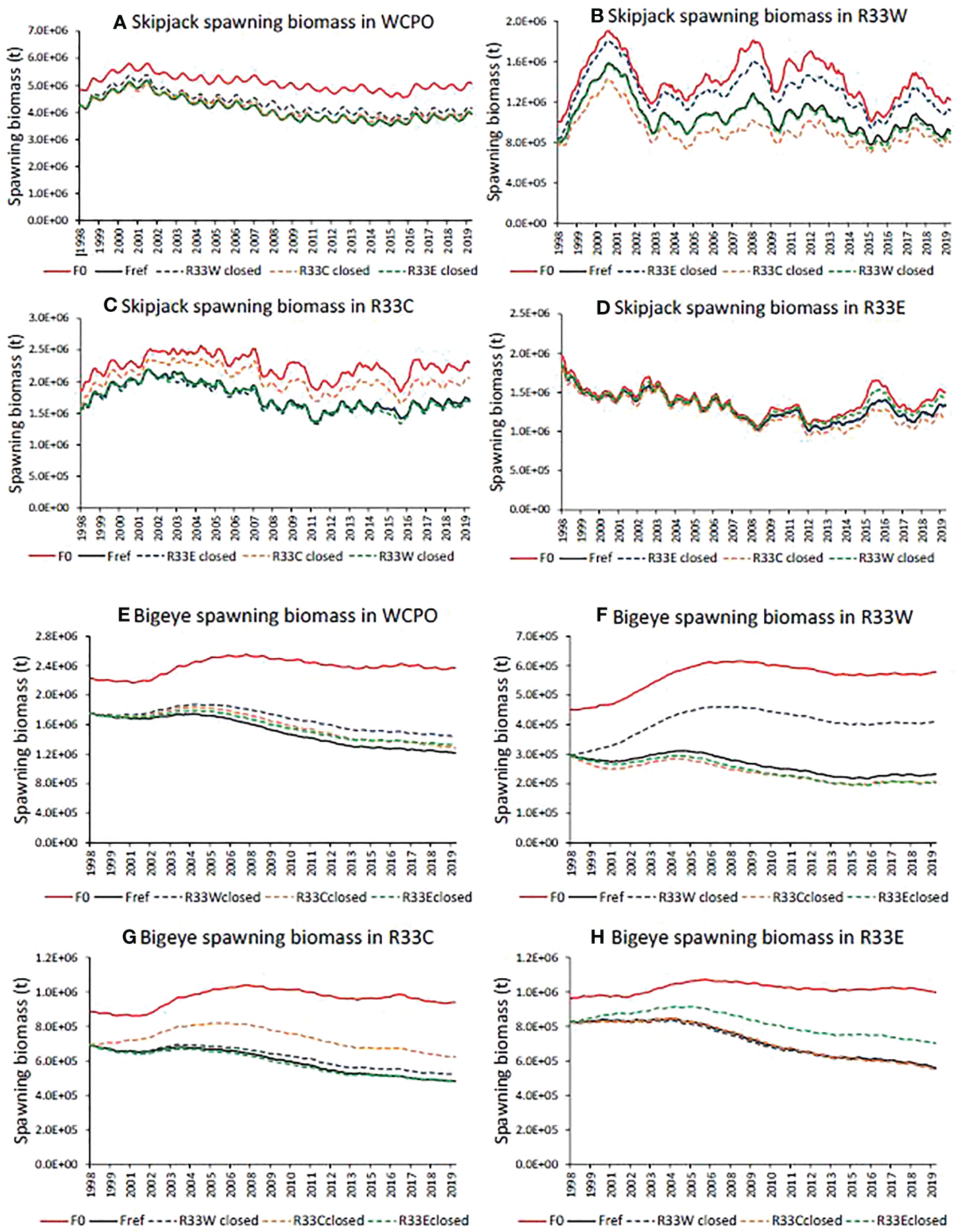 Time series of estimated skipjack (A-D) and bigeye (E-H) tuna spawning biomass in the absence of fishing (F0), under the observed fishing activity (Fref) and for retrospective large closures of approximately 33% of the western and central Pacific Ocean (WCPO) in the west (R33W), central (R33C) and eastern areas (R33E) compiled for the WCPO (A, E), R33W (B, F), R33C (C, G) and R33E (D, H). See Figure 1 for a description of the areas.