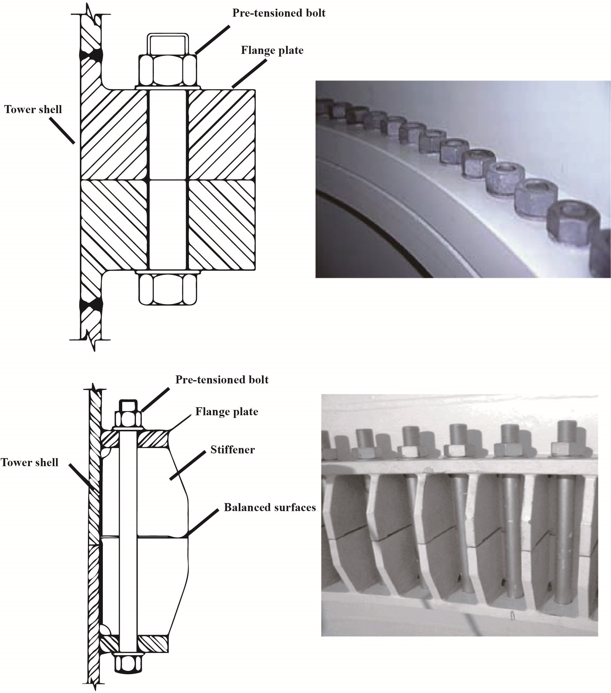 The conventional bolted flanges are L-shaped, as seen in Figure 3. Researchers have extensively investigated the stiffness and mechanical resisting capacities of conventional L-shape flanges (Seidel, 2001; Heistermann et al., 2009; Schwingshackl and Petrov, 2012; Van-Long et al., 2013; Wang et al., 2013). When wind turbines are installed increasingly from shallow water into deep water, the thickness and diameter of wind turbine towers are also increasing to support larger rotors and nacelles accordingly. Another type of flanges are Reverse Balanced (RB) flanges, see Figure 3. The RB flange connections consist of flange plates, stiffening plates, and high–strength blots. Compared to the conventional bolted flanges, RB flanges have advantages such as higher stiffness and lower cost (He et al., 2016).