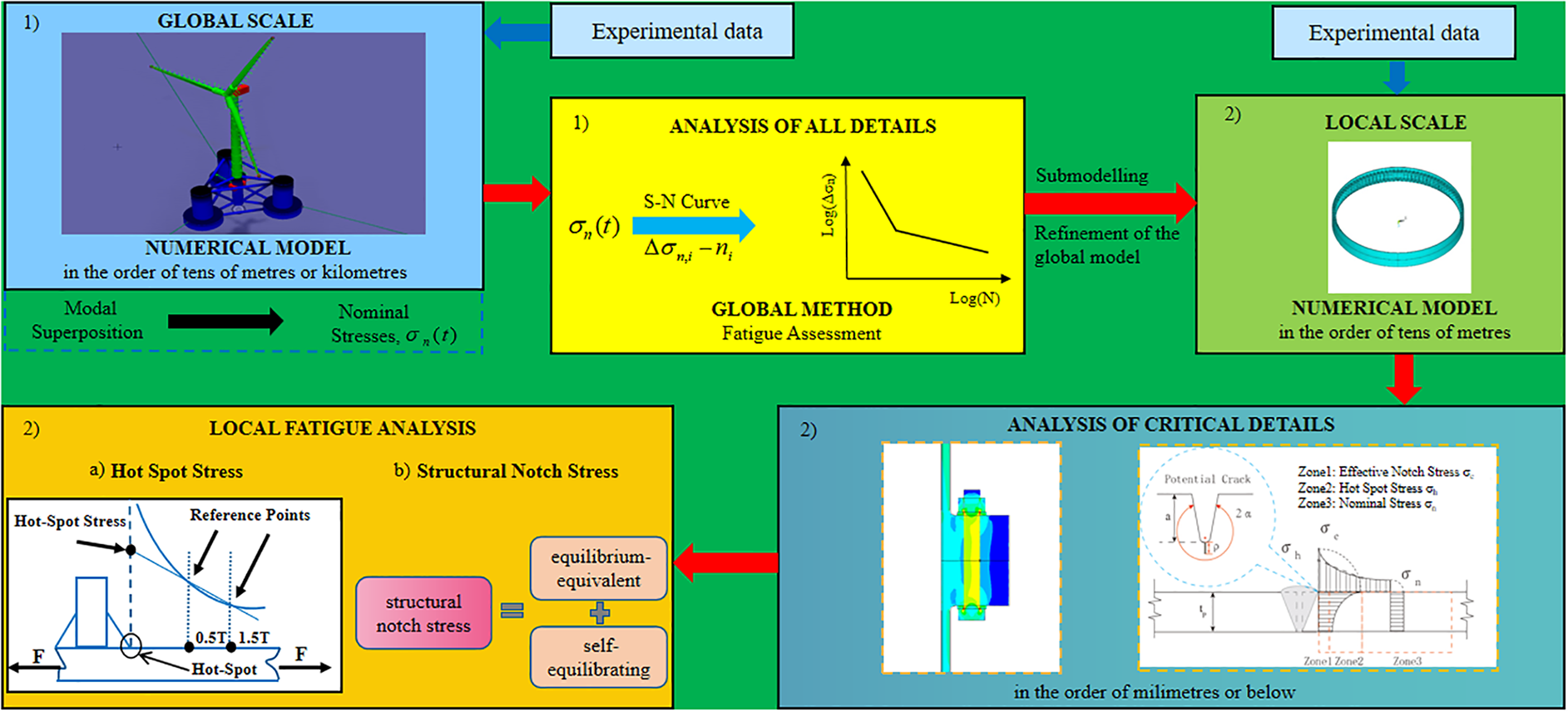 In this section, a global-local methodology of the fatigue calculation procedure is described, emphasizing the theoretical concepts associated with the modal superposition and fatigue methods. A general workflow for the global-local fatigue assessment methodology is suggested in Figure 4, introducing two different phases of analysis that follow an increasing detail of geometrical, material and contact properties as the assessment progresses from the global to the local scale. The two fatigue analysis phases are systematized as follows. In the first phase, a global approach based on the accumulation of damage computed with nominal stresses and S-N curves is introduced. The adopted global numerical model should be accurate enough to obtain nominal stresses to be used as input loading for the linear damage accumulation method. Nonetheless, the available S-N curves with nominal stress may not properly reflect the local geometrical and material characteristics of critical details, and conservative assessment for the fatigue resistance may be considered. Based on this fatigue analysis result, the critical details should be identified which require a more refined assessment by implementing local scale models. Then, in the second phase, submodelling techniques leveraged by modal superposition concepts are used to evaluate accurately local fatigue damage. Hot spot stress and notch stress concepts are proposed to consider more geometrical and local surfaces details (Horas et al., 2022).