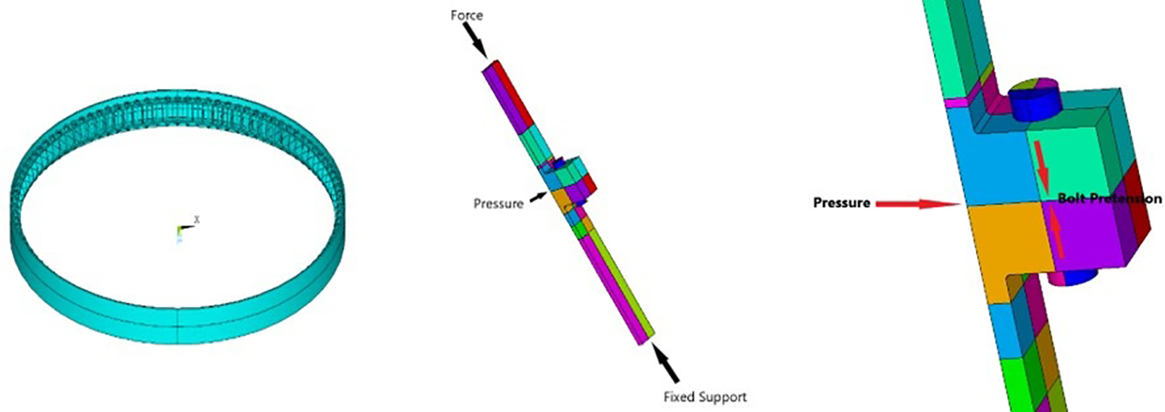 Finite element model of ring shape flanges (left); local model of flanges and its boundary conditions (right).