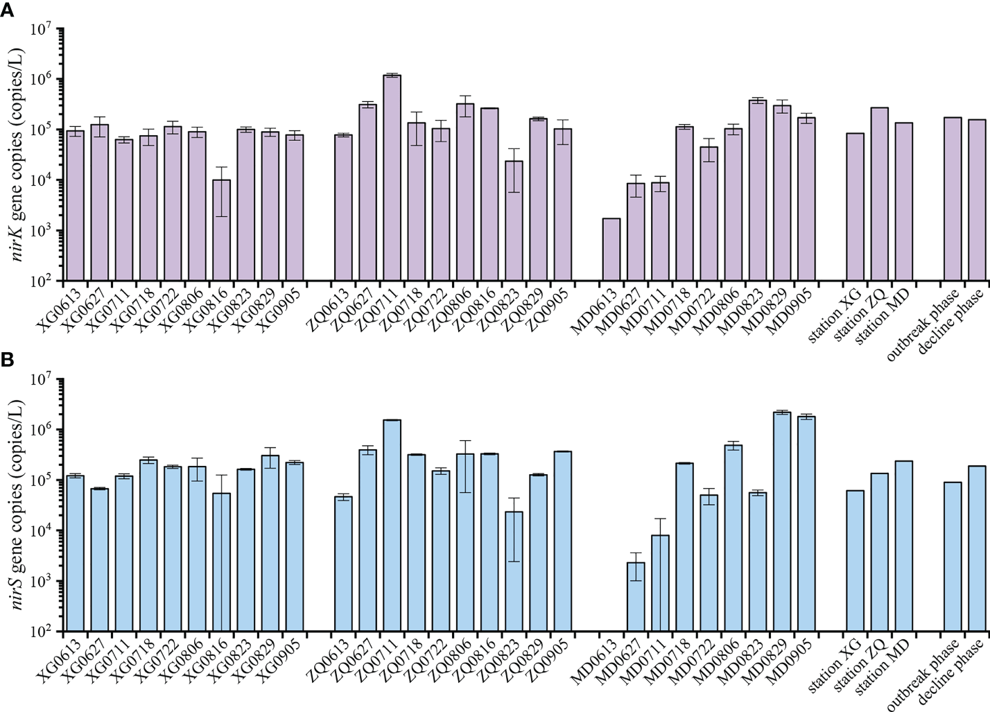 The abundance of the nirK and nirS genes ranged from 1.72×103 to 1.18×106 copies/L and 2.31×103 to 2.19×106 copies/L during the green tide, respectively (Figure 4). The nirK gene was more abundant during the outbreak phase than the decline phase, while the nirS gene exhibited greater abundance during the decline phase, according to our data, but ANOVA analysis revealed no significant difference in the abundance of the nirK and nirS genes between the outbreak phase and the decline phase (P > 0.05). Meanwhile, we discovered that the abundance of the nirK and nirS genes followed a similar pattern across sampling stations, with lower abundance at station XG which was less likely to be influenced by the green tide, and greater abundance at station ZQ and MD which were significantly affected by the green tide. ANOVA analysis revealed that there were no obvious differences in the abundance of the nirK and nirS genes among sampling stations (P > 0.05).