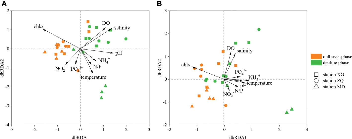 db-RDA analysis of the nirK-type (A) and nirS-type (B) denitrifying bacterial communities with physicochemical factors during the green tide in coastal Qingdao areas.