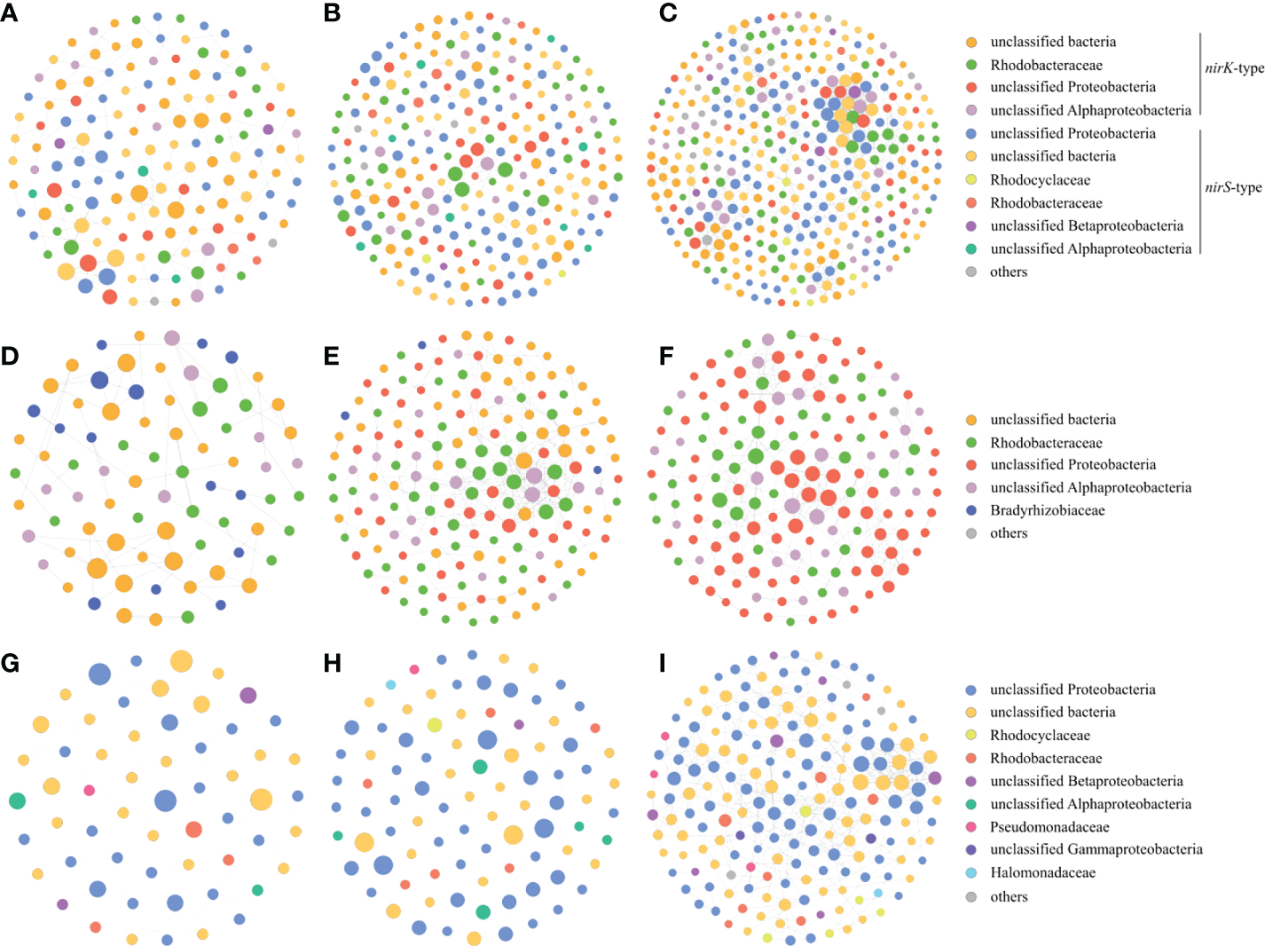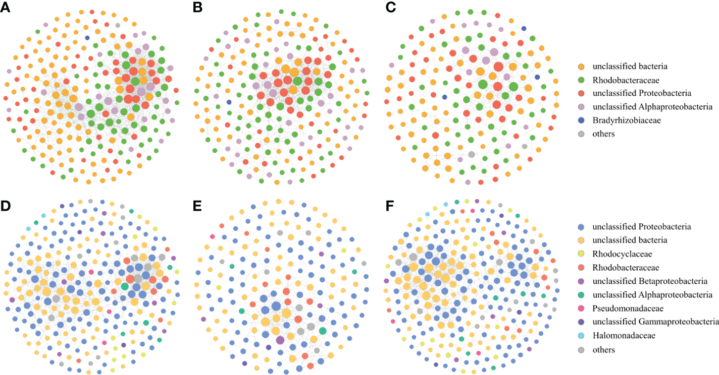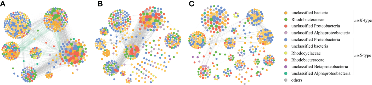 Co-occurrence networks of the denitrifying bacteria during the green tide (A), the outbreak phase (B) and the decline phase (C) in coastal Qingdao areas.