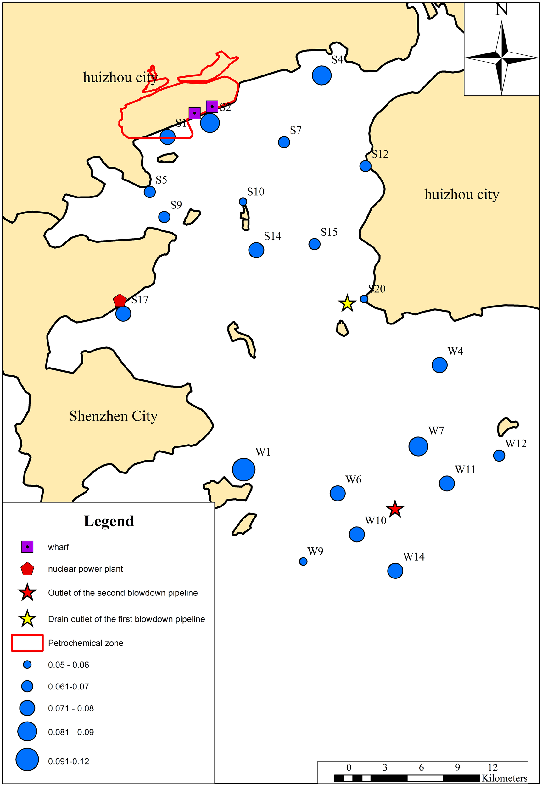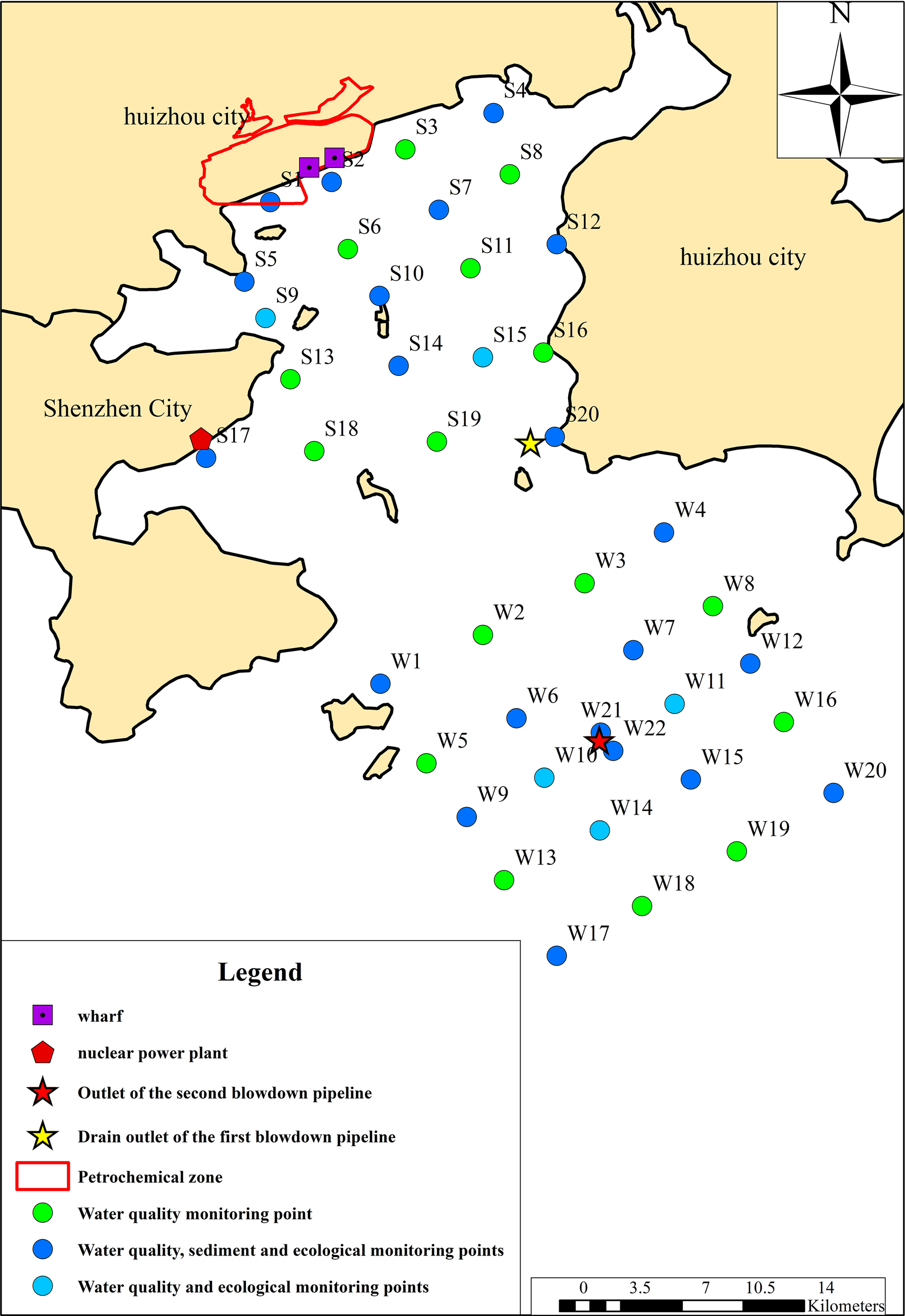 Since the 1980s, Daya Bay has vigorously developed petrochemical-based industries, the good ecological environment has led to the rapid development of aquaculture, two nuclear power plants located on the west coast were put into operation in 1994 and 2002, and the first and second deep-sea outfall pipelines were put into operation in 2000 and 2017, respectively. These anthropogenic activities have led to heavy metal contamination of seawater, sediments and organisms in Daya Bay.