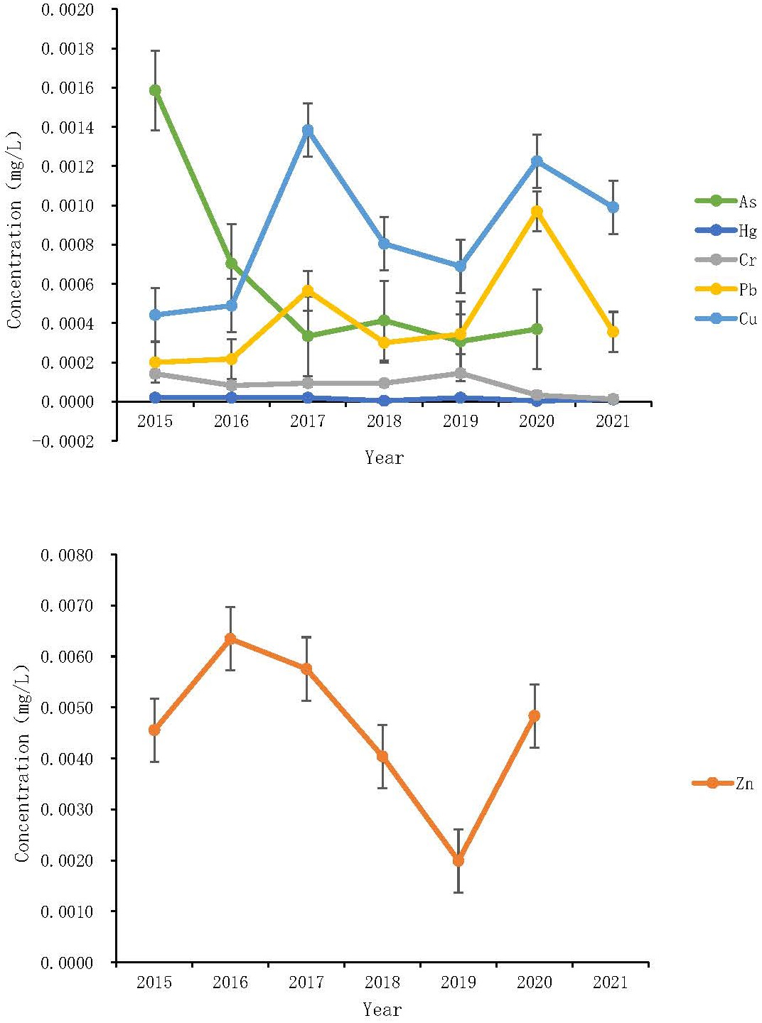 Change trend of heavy metals in seawater from 2015 to 2021.