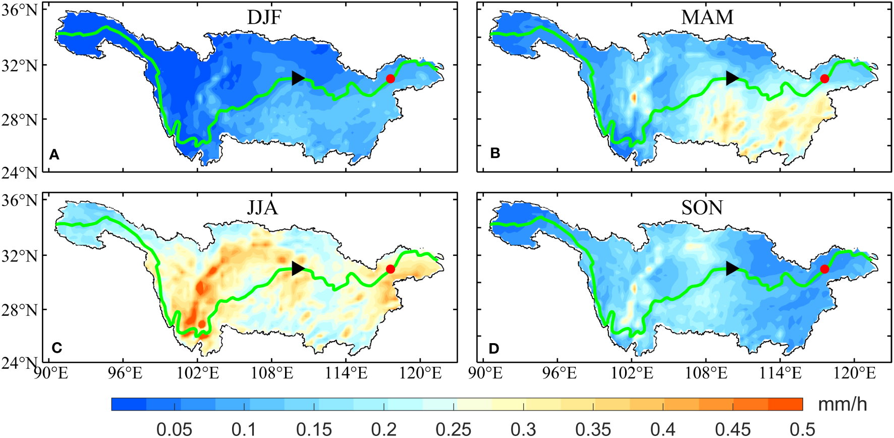 Seasonal climatological distributions of precipitation (A) December–January–February (DJF), (B) March–April–May (MAM), (C) June–July–August (JJA), and (D) September–October–November (SON) over the Yangtze River Basin from 2018 to 2021. The black triangle shows the position of the Three Gorges Dam (TGD), and the red dot shows the location of the Datong (DT) station.