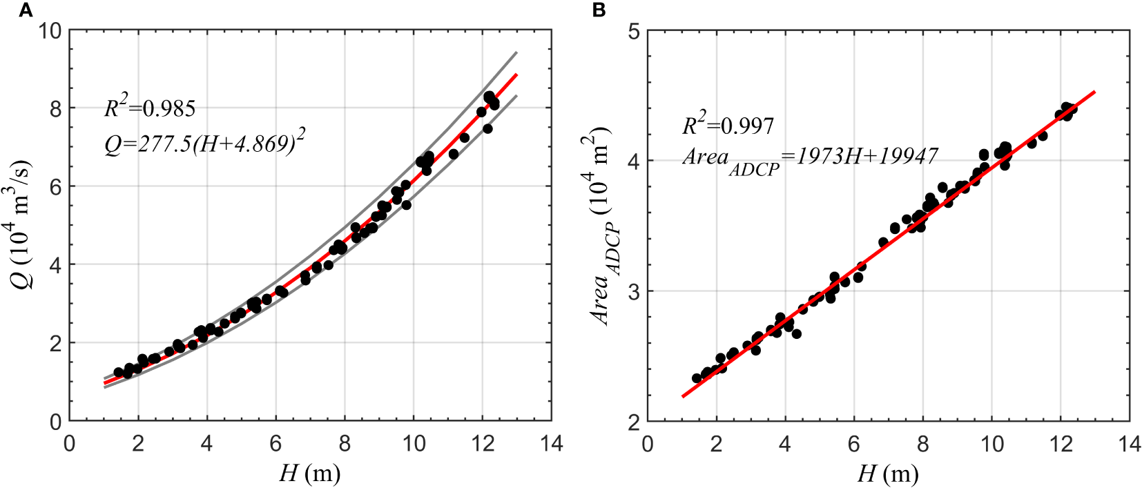 (A) RC relationship (red line) build using moving-boat ADCP results, gray lines represent the 95% confidence level; (B) Linear empirical relationship between the water depth (H) and moving-boat ADCP measured area (AreaADCP).