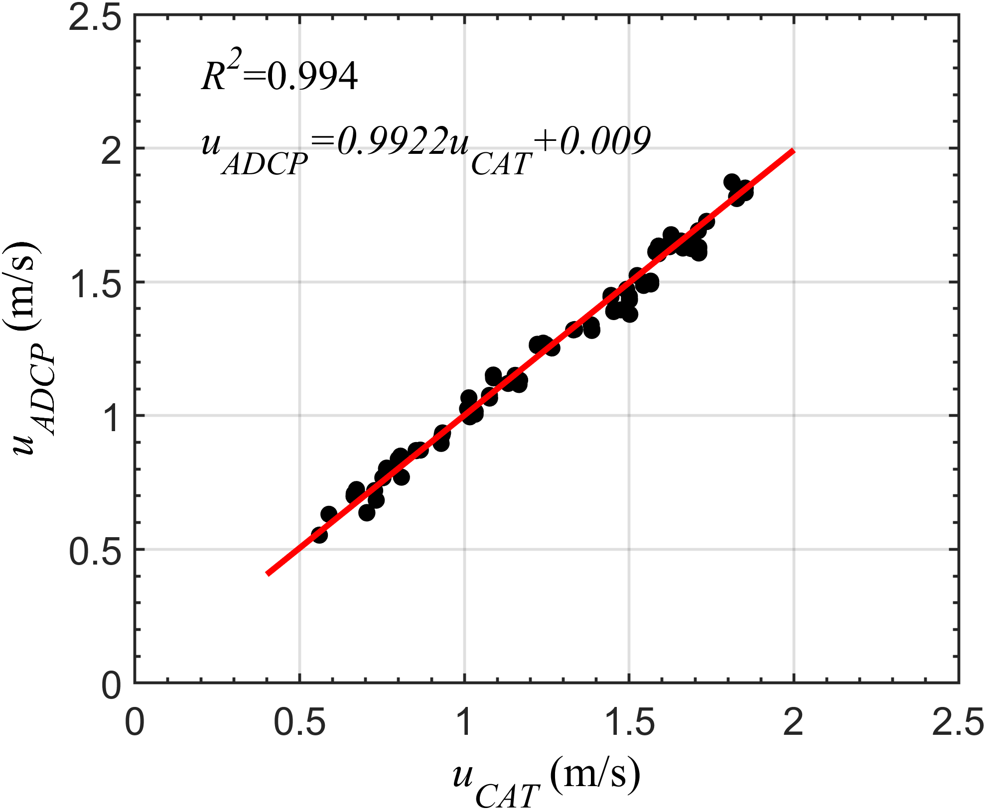 Kawanisi et al. (2013) stated that the incorrect resolve of angle (θ) between the transmission line and the main flow direction might cause a considerable discharge estimation error and revealed that variations of ±1° could induce relative discharge errors of −5.4 and 5.5%. Hence, this study utilized an index velocity for uCAT to avoid estimating flow direction. The index velocity ratings are shown in Figure 4. The index velocity curve for CAT was resolved using linear regression, the measured section-averaged velocity uADCP = QADCP/AADCP, with QADCP representing the moving-boat ADCP discharge and AADCP representing the sectional area along the ADCP transect. Finally, the streamflow of CAT can be computed by: