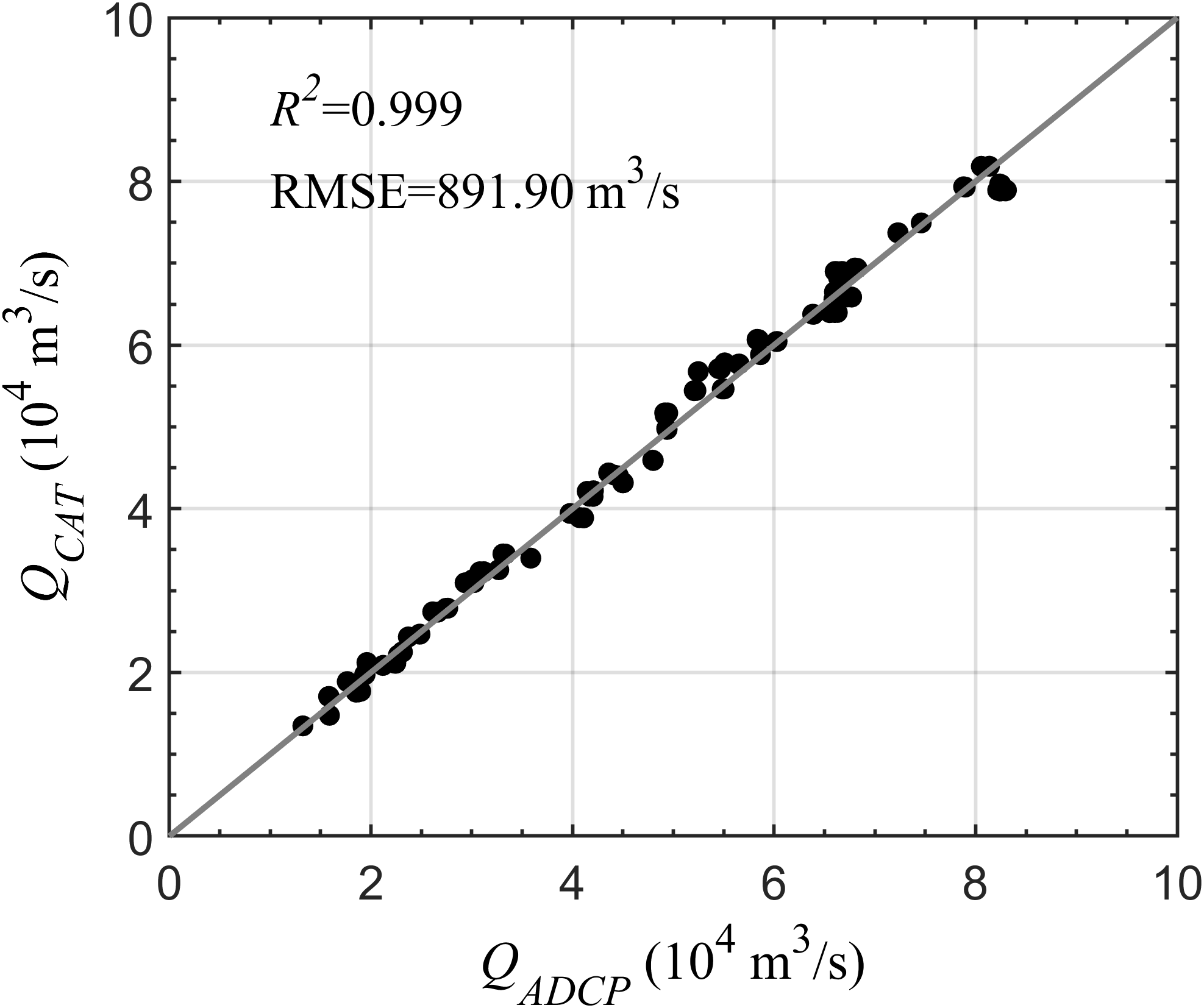 CAT- and RC-derived discharges are shown in Figure 5A. Discharges of the YR ranged from 11,059 to 82,206 m3/s from July 2018 to January 2021 and displayed an evident seasonal variation. The discharge exhibits high consistency with the rainfall pattern, with fluctuations of high discharge and precipitation in summer and low discharge and precipitation in winter (Figure 5A). CAT shows a good consistency with the moving-boat ADCP results. The comparison between QADCP and QCAT showed a good correlation with R2 = 0.999 and RMSE = 891.9 m3/s (Figure 6). Compared with previous studies (Zhu et al., 2021), the results of this study are higher by approximately 1%, which is mainly due to the index method and the consideration of the flow angle.