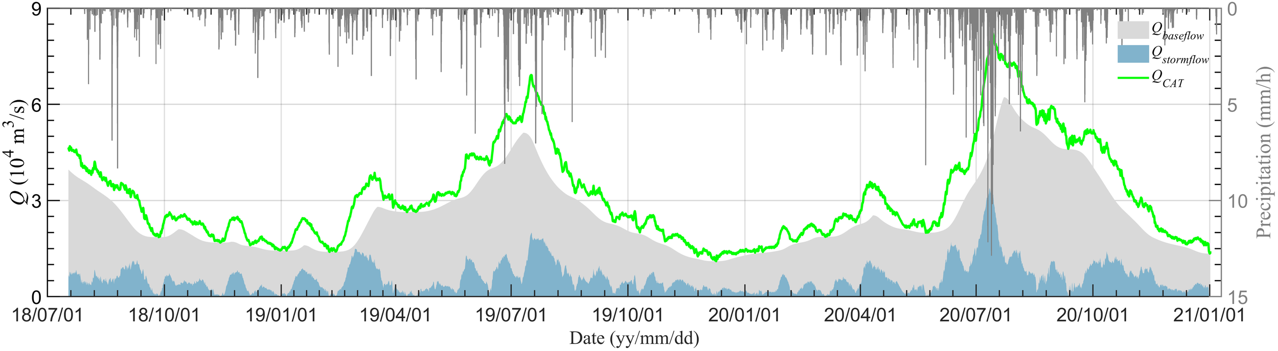 Time series of baseflow and stormflow obtained from QCAT during the observation period (July 2018 to January 2021).