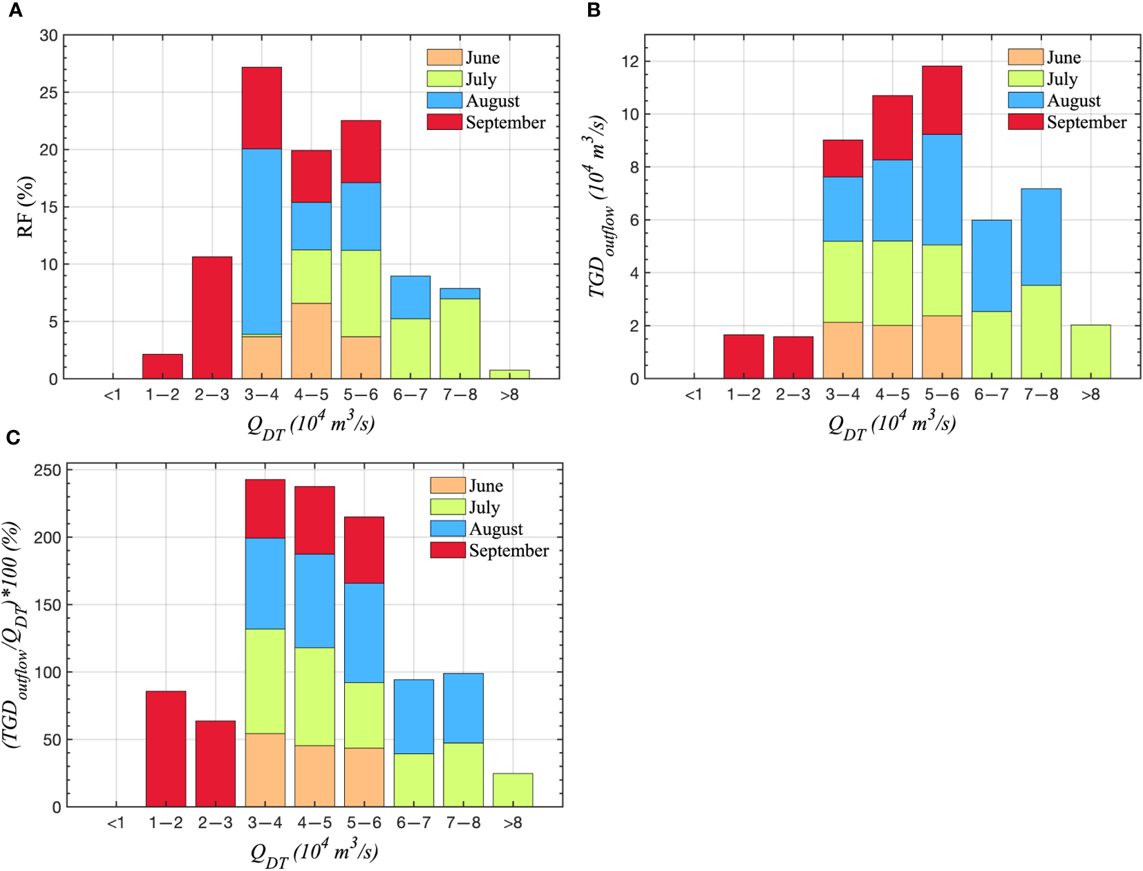 Grouped distributions of TGD outflow varied with the DT discharge (QDT) during the wet season (June–September). (A) Relative frequency (RF) of TGD outflow; (B) Grouped TGD outflow in each QDT class; (C) The proportions of TGD outflow in each QDT class.