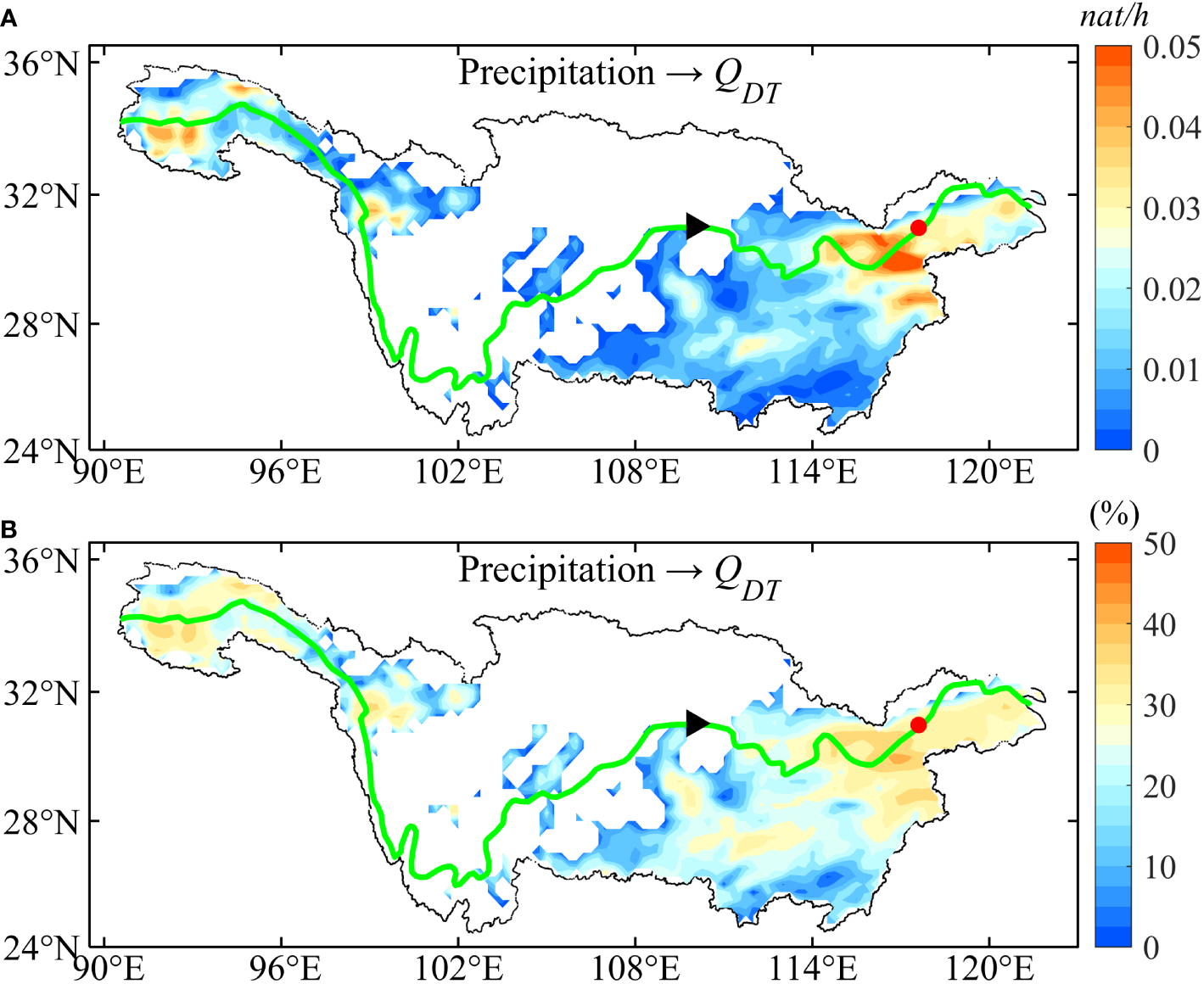 Distributions of results of the one-way causality analysis in the Yangtze River Basin. (A) Rate of information flow (IF) from precipitation to discharge at the DT station (QDT); (B) Relative IF from precipitation to discharge at the DT station (QDT). Since the precipitation data is of hourly interval, the hourly QDT was picked up to match the time of precipitation data. Only positive values are presented in the figure, while the non-positive values are masked by white.