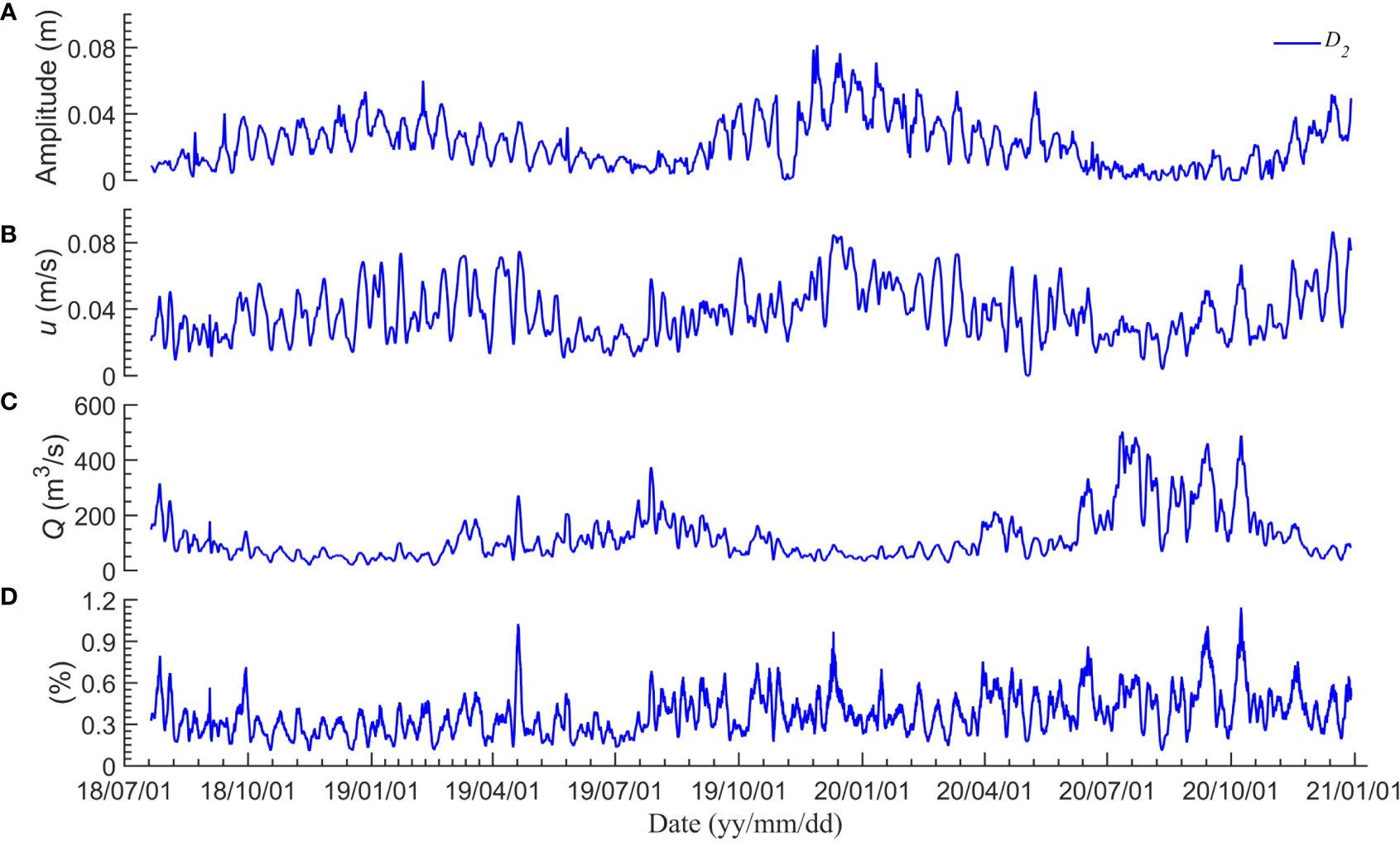 Time series of the results of the continuous wavelet transform (CWT) results at the Datong station. (A–C) Amplitude, velocity, and discharge in the semi-diurnal (D2) band; (D) Proportion of the semi-diurnal discharge in the total discharge.