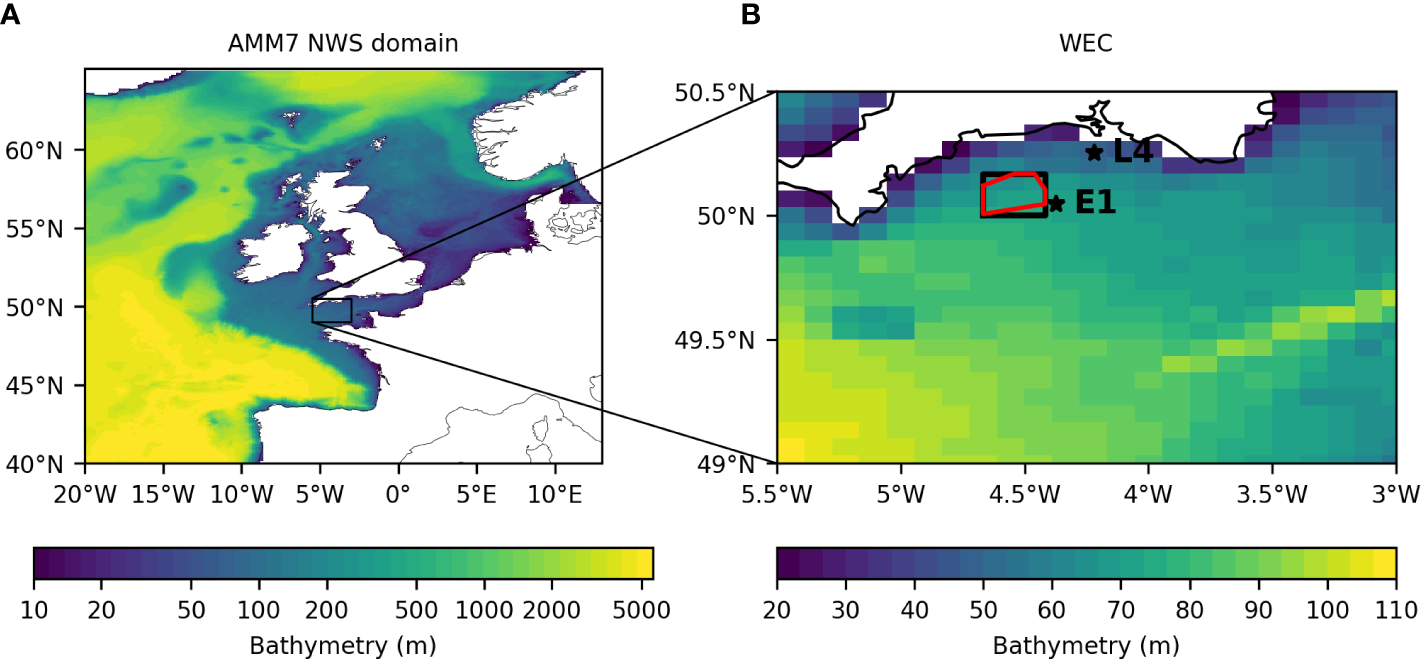 (A) AMM7 model domain and (B) close-up on the WEC, colored by the model bathymetry. In (B), the solid black box shows the area for which the stochastic prediction model produced chl-a forecasts. The red polygon shows the region in which the glider was allowed to travel and in which waypoints could be calculated. The stars show the location of the E1 and L4 time series stations.